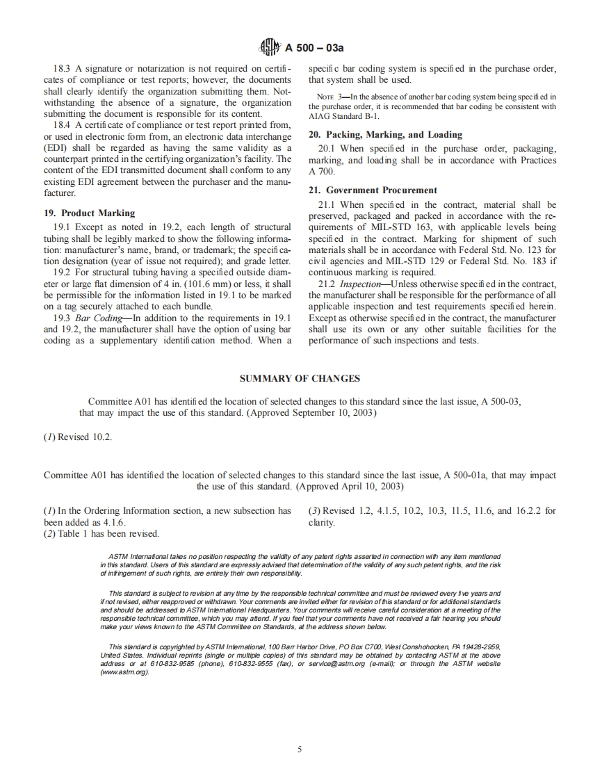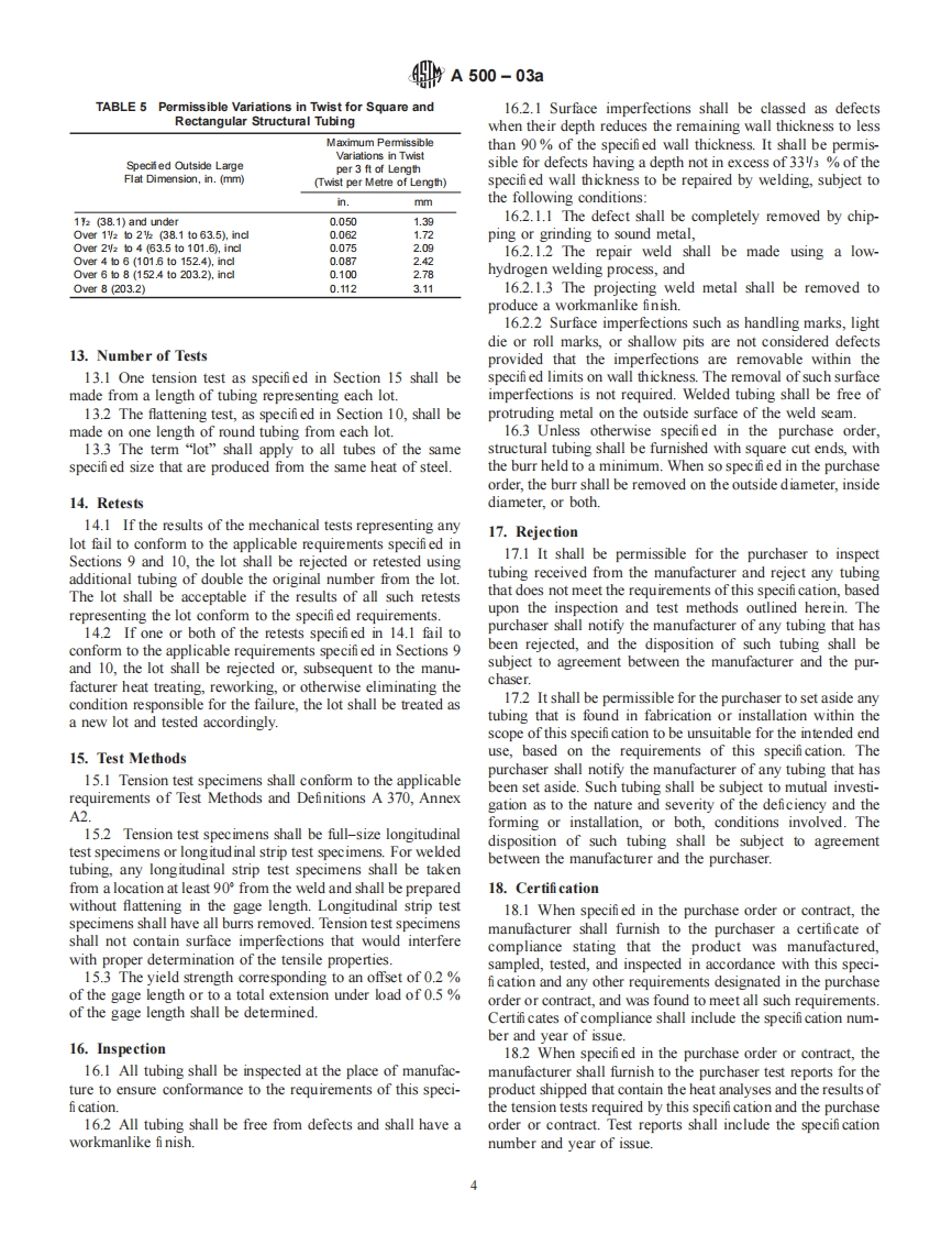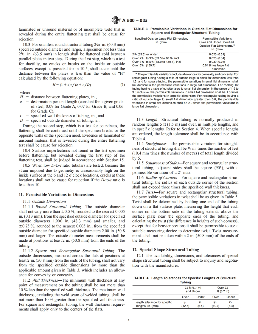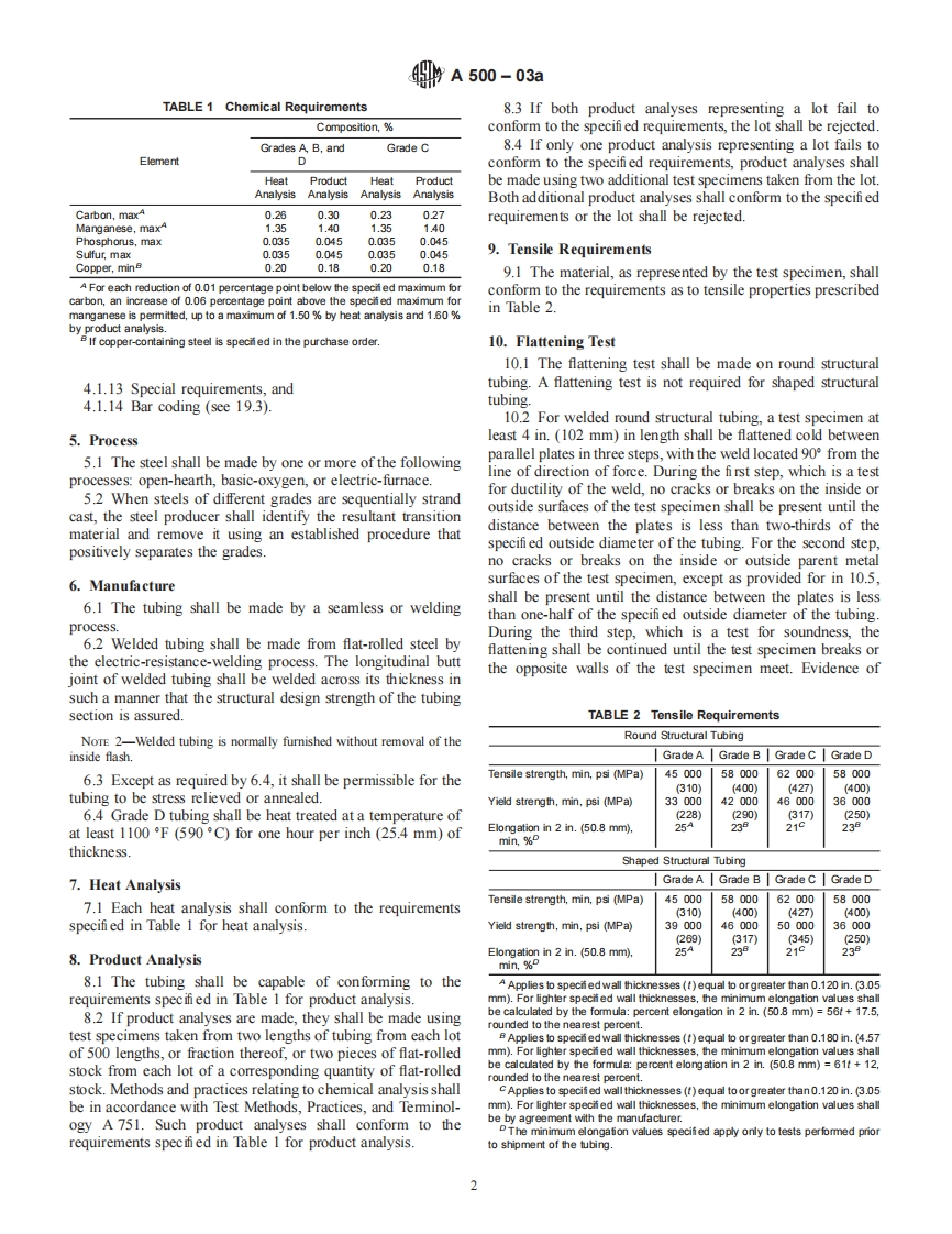 Designation:A 500-03aNTERNATIONALStandard Specification forCold-Formed Welded and Seamless Carbon Steel StructuralTubing in Rounds and Shapes1This standard is issued under the fixed designation A500,the number immediately following the designation indicates the year oforiginal adoption or,in the case of revision,the year of last revision.A number in parentheses indicates the year of last reapproval.Asuperscript epsilon (e)indicates an editorial change since the last revision or reapproval.This standard has been approved for use by agencies of the Department of Defense.1.Scope*A 941 Terminology Relating to Steel,Stainless Steel,Re-1.1 This specification covers cold-formed welded and seam-lated Alloys,and Ferroalloysless carbon steel round,square,rectangular,or special shape2.2 Military Standards:structural tubing for welded,riveted,or bolted construction ofMIL-STD-129 Marking for Shipment and Storage3bridges and buildings,and for general structural purposes.MIL-STD-163 Steel Mill Products,Preparation for Ship-1.2 This tubing is produced in both welded and seamlessment and Storage*sizes with a periphery of 64 in.(1626 mm)or less,and a2.3 Federal Standards:specifi ed wall thickness of 0.625 in.(15.88 mm)or less.GradeFed.Std.No.123 Marking for ShipmentD requires heat treatment.Fed.Std.No.183 Continuous Identifi cation Marking ofIron and Steel Products3NorE 1-Products manufactured to this specification may not be2.4 AlAG Standard:suitable for those applications such as dynamically loaded elements inwelded structures,etc.,where low-temperature notch-toughness propertiesB-1 Bar Code Symbology Standard4may be important.3.Terminology1.3 The values stated in inch-pound units are to be regarded3.1 Defi nitions-For defi nitions of temms used in this speci-as standard.The values given in parentheses are mathematicalfi cation,refer to Terminology A 941.conversions of the values in inch-pound units to values in SIunits.4.Ordering Information1.4 The text of this specification contains notes and foot-4.1 Orders for material under this specification shall containnotes that provide explanatory material.Such notes and foot-information concerning as many of the following items as arenotes,excluding those in tables and fi gures,do not contain anyrequired to describe the desired material adequately:mandatory requirements.4.1.1 Quantity (feet or number of lengths).2.Referenced Documents4.1.2 Name of material (cold-formed tubing),2.1 ASTM Standards:24.1.3 Method of manufacture (seamless or welded).4.1.4 Grade (A.B.C.or D).A 370 Test Methods and Defi nitions for Mechanical Testing4.1.5 Size (outside diameter and wall thickness for roundof Steel Productstubing,and outside dimensions and wall thickness for squareA 700 Practices for Packaging,Marking,and Loadingand rectangular tubing),Methods for Steel Products for Domestic Shipment4.1.6 Copper-containing steel (see Table 1),if applicable,A 751 Test Methods,Practices,and Terminology for4.1.7 Length (random,multiple,specifi c