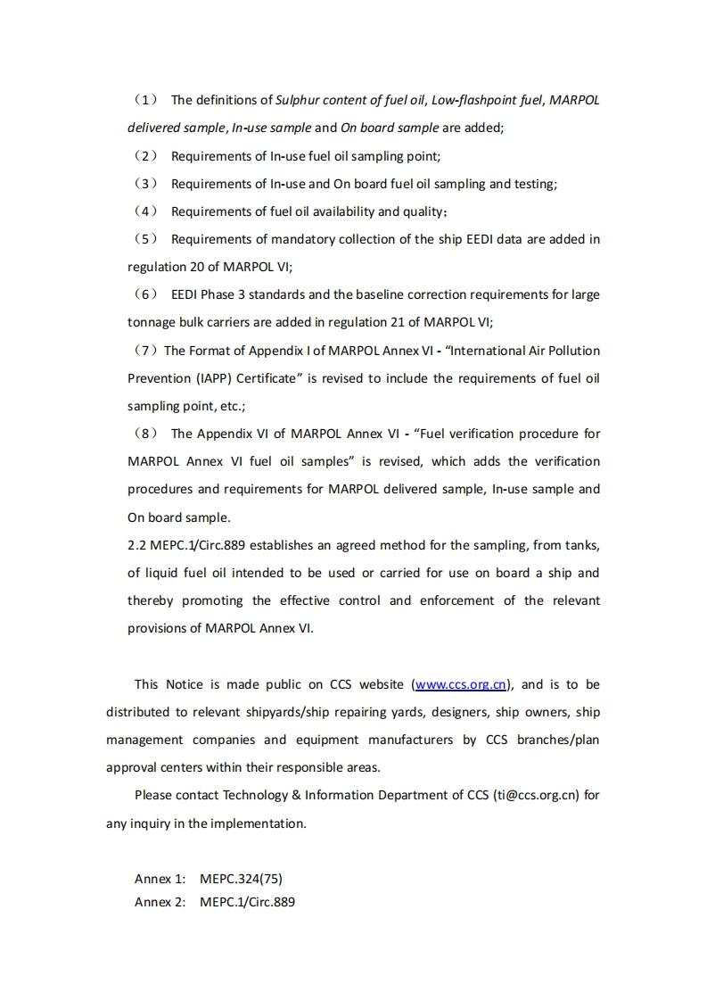 CCSTechnical Information(2021)Technical Information No.24 Total No.530Jul.08,2021(Total 2 pages+Annexes)To:Relevant shipowners,ship management companies,shipyards and designers,productmanufacturer,related departments of the Headquarters of CCS,the Society's surveyors,Plan Approval CentersTechnical Notice on MEPC.324(75)and MEPC.1/Circ.889Issued by IMO1.BackgroundAmendments to MARPOL Annex VI(MEPC.324(75))concerning procedures forsampling and verification of the sulphur content of fuel oil and the Energy EfficiencyDesign Index(EEDI),were adopted at the 75th session of the Marine EnvironmentalProtection Committee(MEPC 75)of the International Maritime Organization(IMO)inNovember 2020.The resolution shall be deemed to have been accepted on 1 October 2021unless prior to that date,not less than one third of the Parties or Parties thecombined merchant fleets of which constitute not less than 50%of the gross tonnageof the world's merchant fleet,have communicated to the Organization theirobjection to the amendments.The amendments shall enter into force on 1 April2022 upon their acceptance in accordance with the above.In addition,MEPC 75 approved the 2020 Guidelines for on board sampling offuel oil intended to be used or carried for use on board a ship (MEPC.1/Circ.889),which stipulates the unified method for the sampling,from tanks,of liquid fuel oilintended to be used or carried for use on board a ship.2.Main content of MEPC.324(75)and MEPC.1/Circ.8892.1 The main contents of the amendment include: