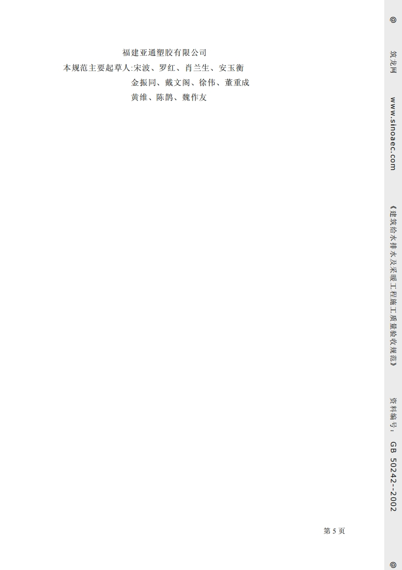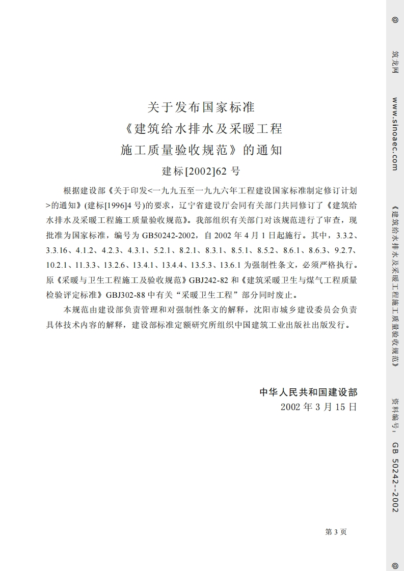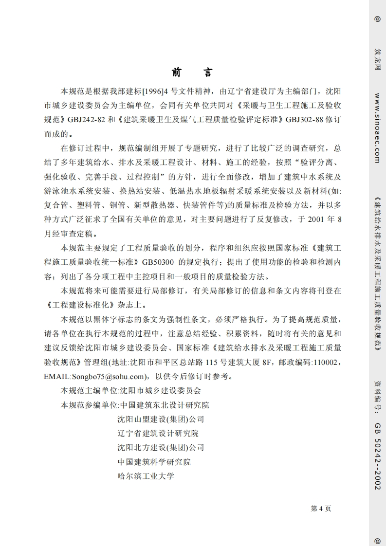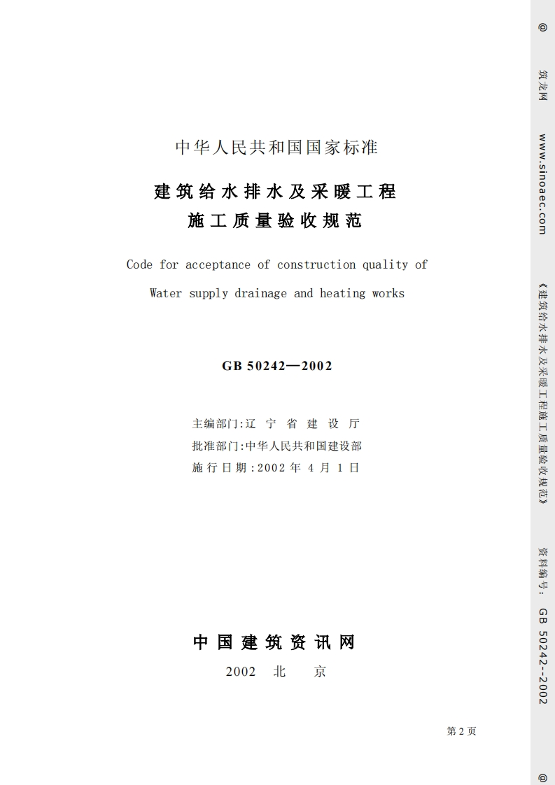 回UDC中华人民共和国国家标准PGB50242-2002建筑给水排水及采暖工程www.sinoaec.com施工质量验收规范Code for acceptance of construction quality ofWater supply drainage and heating works2002—03一15发布2002-04-01实施中华人民共和国建设部联合发布国家质量监督检验检疫总局50242--2202第1页回