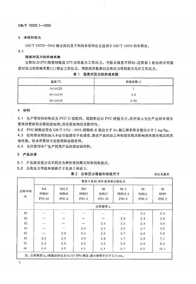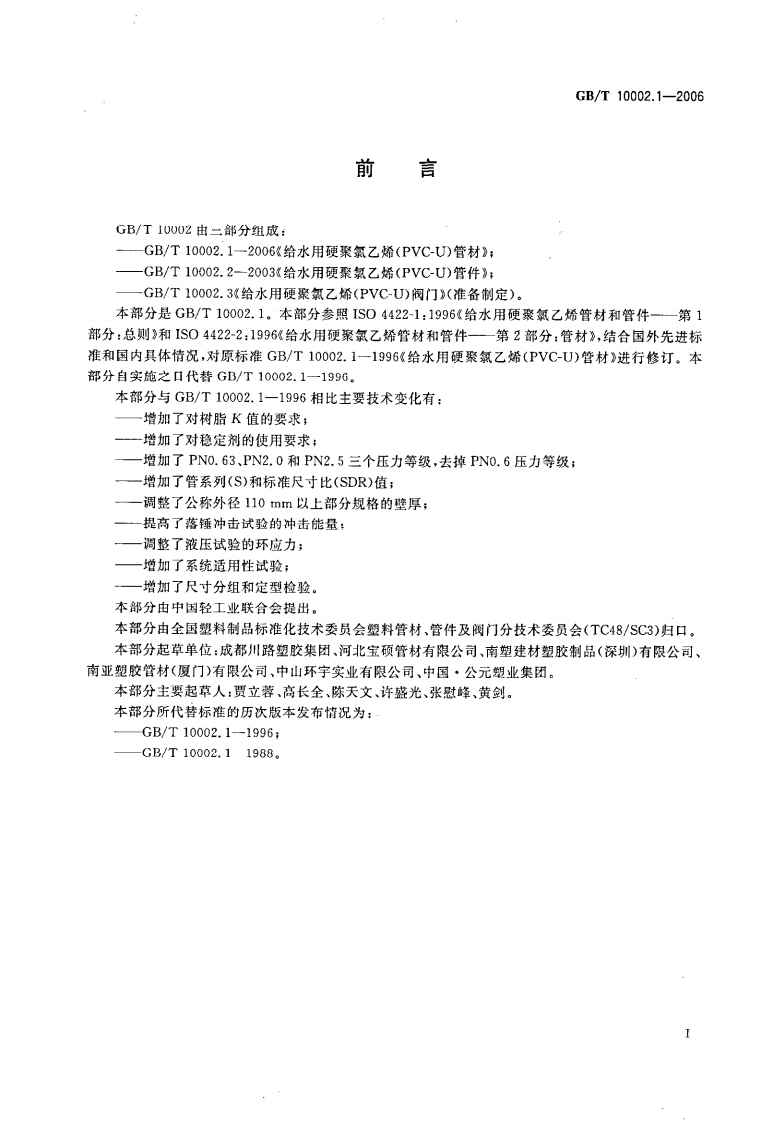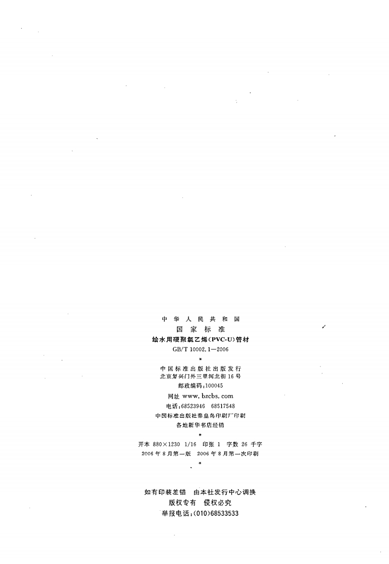 ICS83.140.30G33中华人民共和国国家标准GB/T10002.1一2006代替GB/T10002.1一1996给水用硬聚氯乙烯(PVC-U)管材Unplasticized poly (vinyl chloride)(PVC-U)pipes for water supplyCISO 4422:1996,Pipes and fittings made of unplasticied poly (vinylchloride)(PVC-U)for water supply-Specifications,NEQ]2006-02-21发布2006-08-01实施中华人民共和国国家质量监督检验检疫总局中国国家标谁化管理委员会发布数码防伪