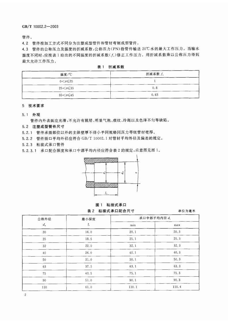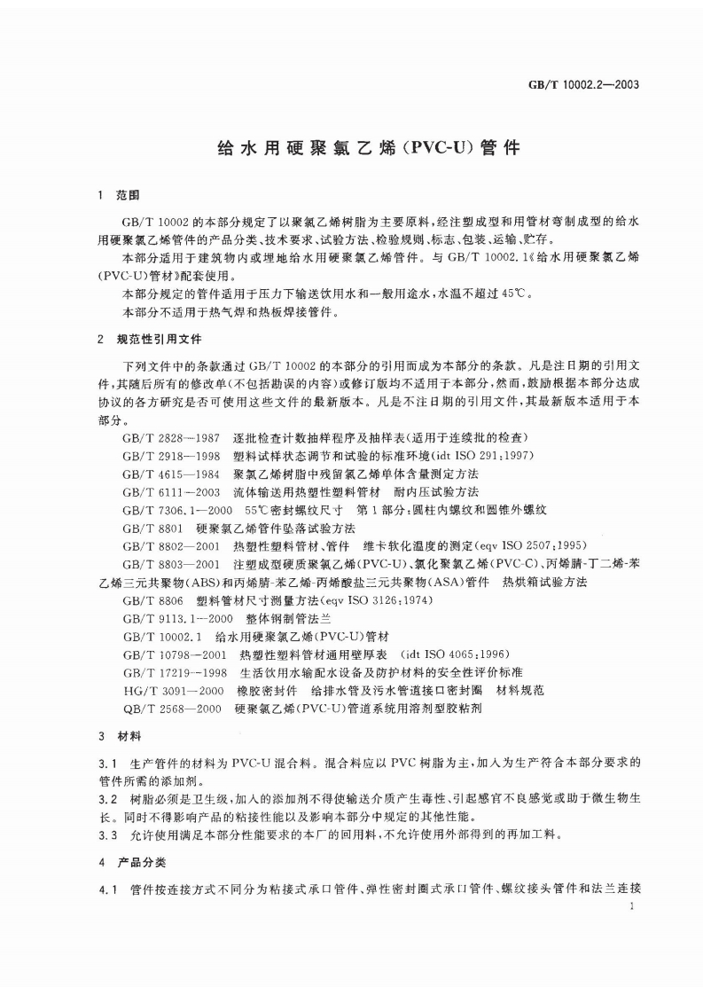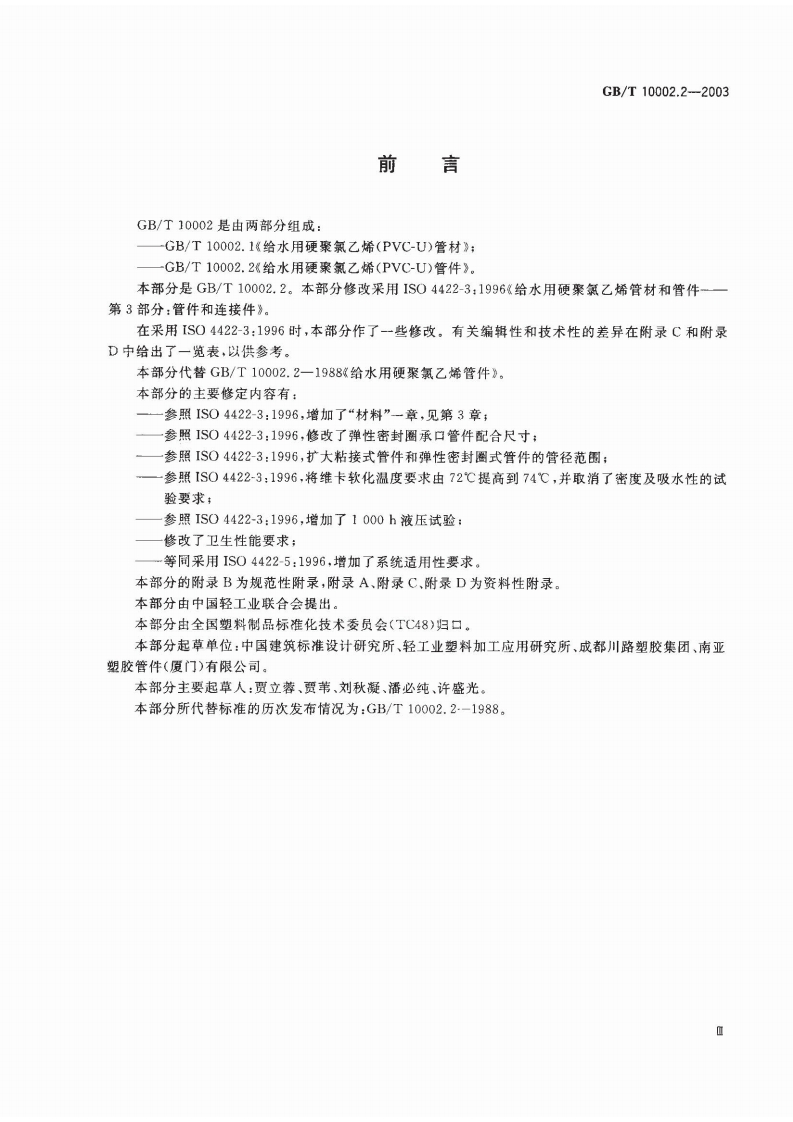 GB/T10002.2-2003目次前言…4…瓜1范围12规范性引用文件3材料…4产品分类004044404444444+…5技术要求26试验方法67检验规则8标志、包装、运输、贮存……………4……4…………………附录A(资料性附录)管件安装尺寸………9附录B(规范性附录)系统适应性试验方法……………26附录C(资料性附录)本部分章条编号与1S04422-3:1996章条对照…35附录D(资料性附录)本部分与1S04422-3:1996技术性差异及其原因…36