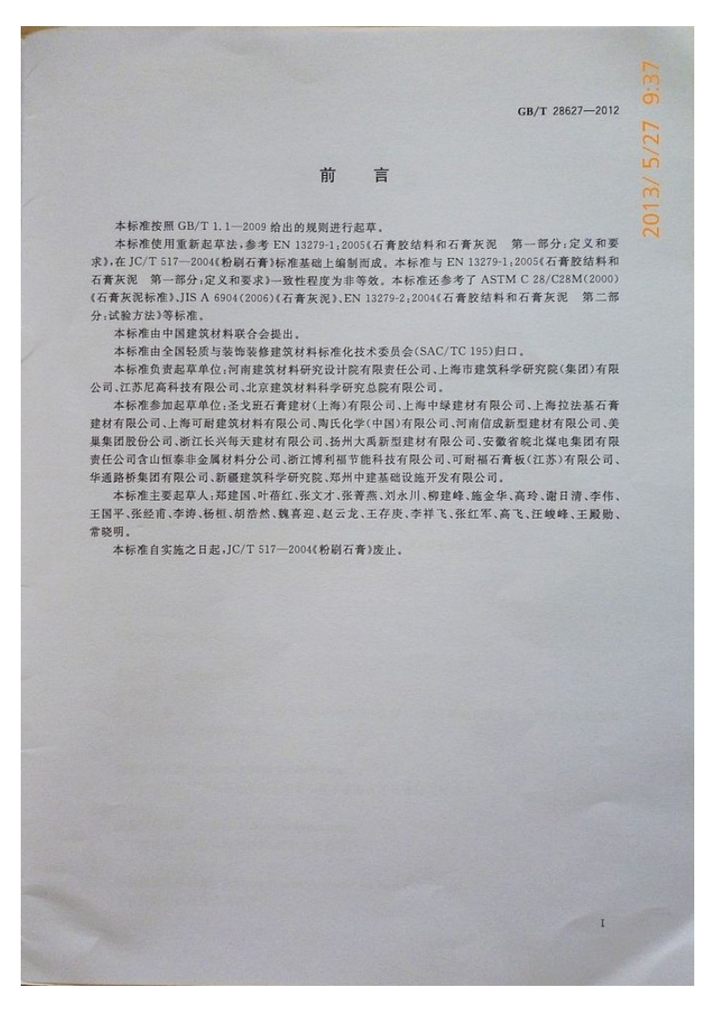 GBt28627348072@abc16天前发布关注私信1.26MB12页020GBt28627此内容为付费资源,请付费后查看¥23¥36黄金会员免费钻石会员免费立即购买您当前未登录!建议登陆后购买,可保存购买订单付费资源 第1页 / 共12页 第2页 / 共12页 第3页 / 共12页 第4页 / 共12页 第5页 / 共12页 试读已结束,还剩7页,您可下载完整版后进行离线阅读 THE END标准规范 文本预览 1s91.100.10Q13GB7E7中华人民共和国国家标准GB/T28627-2012抹灰石膏Gypsum plaster2012-07-31发布2013-02-01实施中华人民共和国国家质量监督检验检疫总局中国国家标准化管理委员会发布 查看更多 收起部分 喜欢就支持一下吧收藏