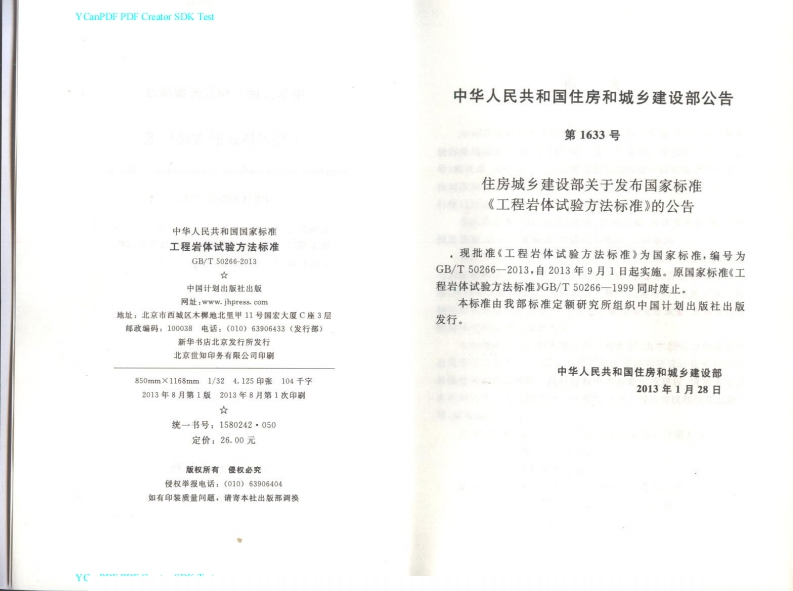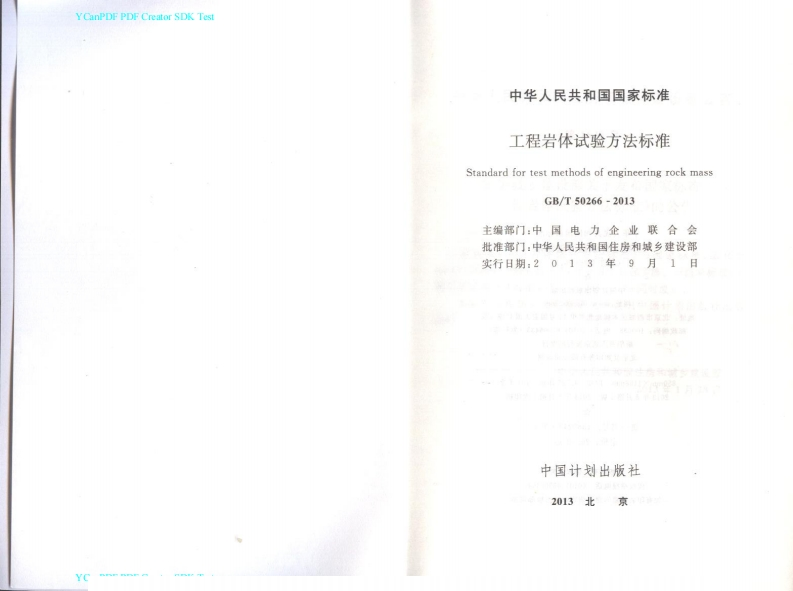 YCanPDF PDF Creator SDK TestC中华人民共和国国家标准GBGB/T50266-2013工程岩体试验方法标准Standard for test methods of engineering rock mass13-01-28发布中周时划金展超2013-09-01实施S/N:1580242.050统一书号:1580242.050定价:28.00元1华人民共和国住房和城乡建设部华人民共和国国家质量监督检验检疫总局联合发布9158024205008>