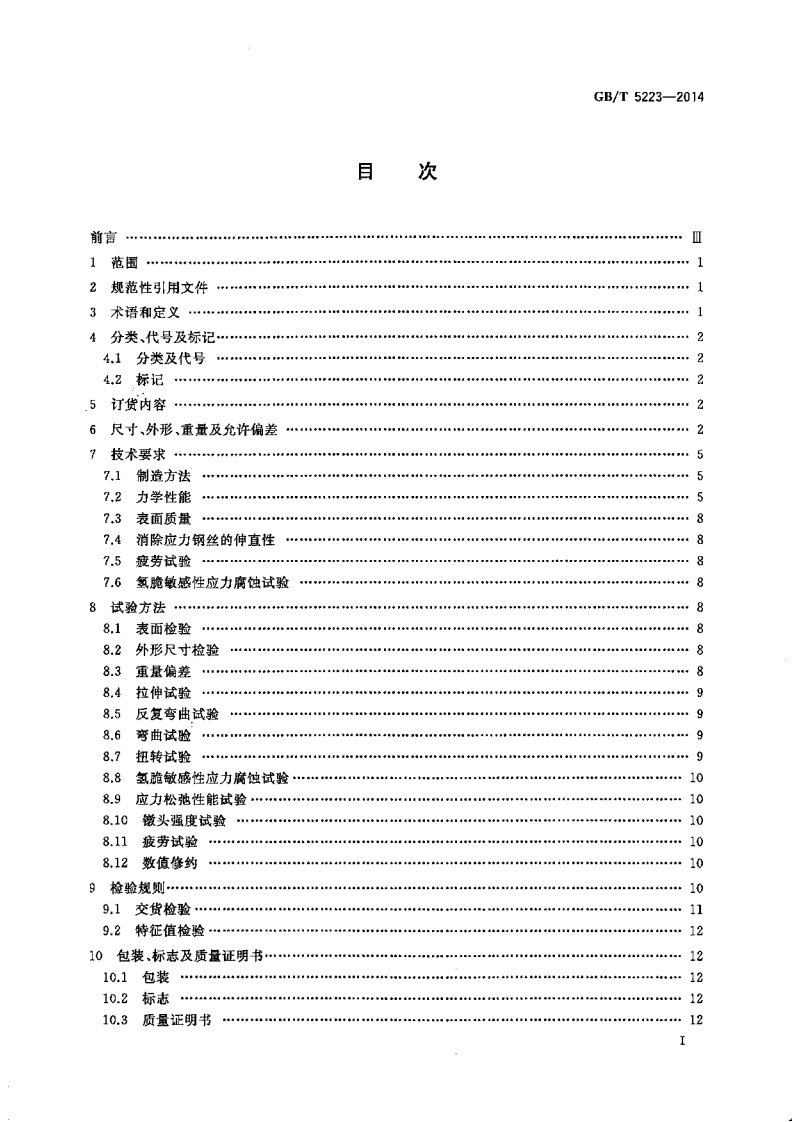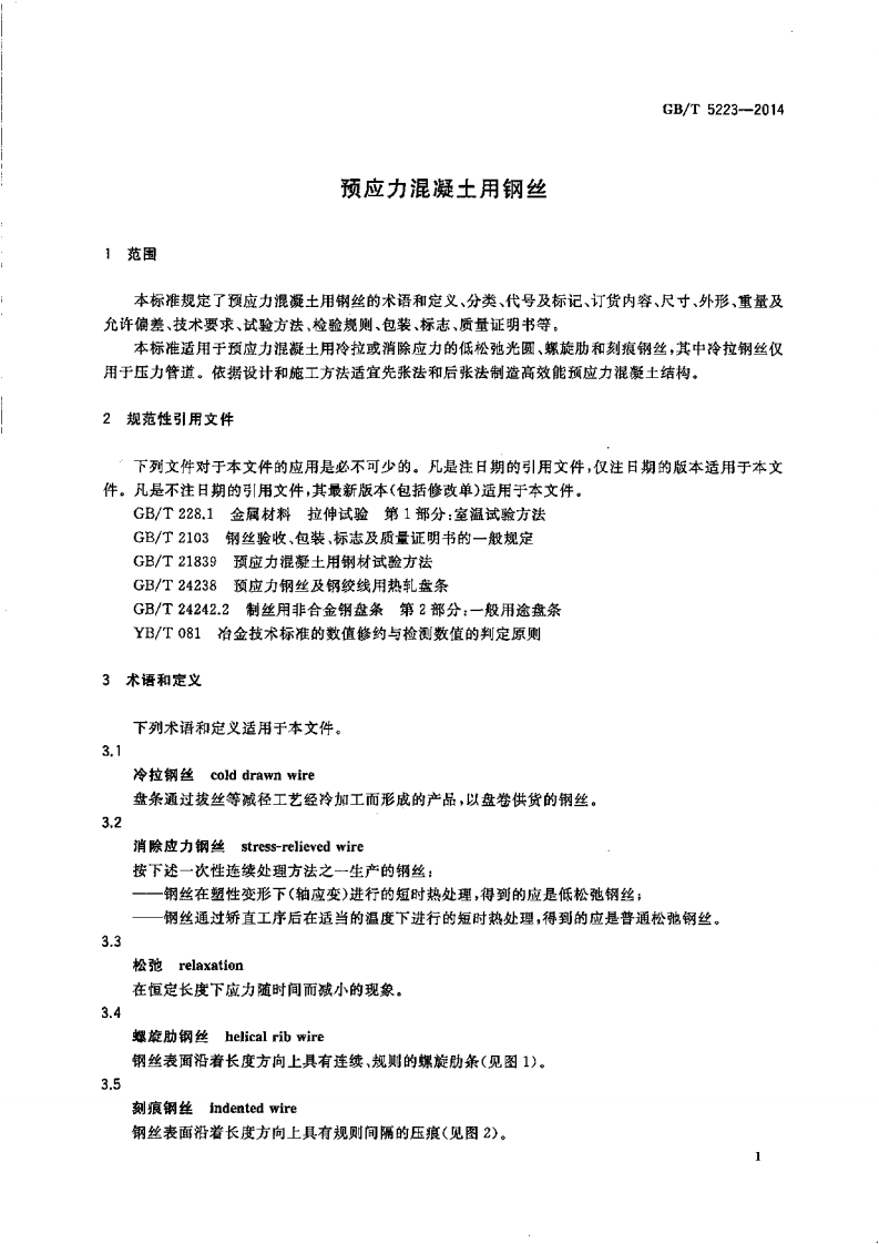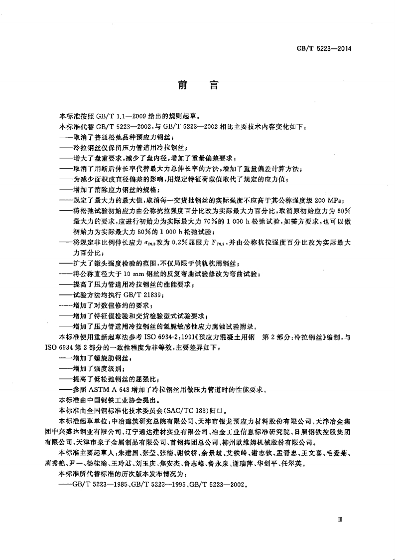 g7.140.15中华人民共和国国家标准GB/T5223-2014代替GB/T5223-2002预应力混凝土用钢丝Steel wire for prestressing of concrete(ISO 6934-2:1991,Steel for the prestressing of concrete-Part 2:Cold-drawn wire,NEQ)2014-06-24发布2015-04-01实施Φ中华人民共和国国家质量监督检验检疫总局中国国家标准化管理委员会发布