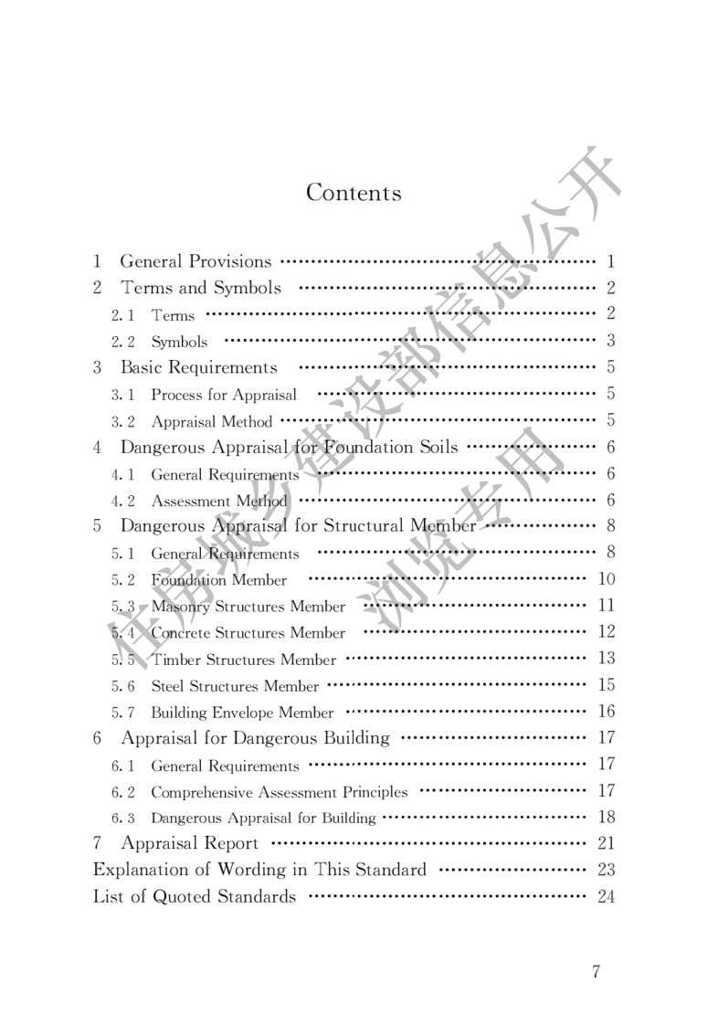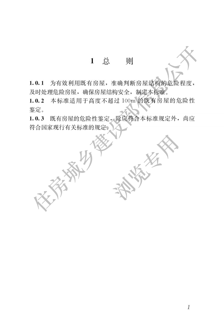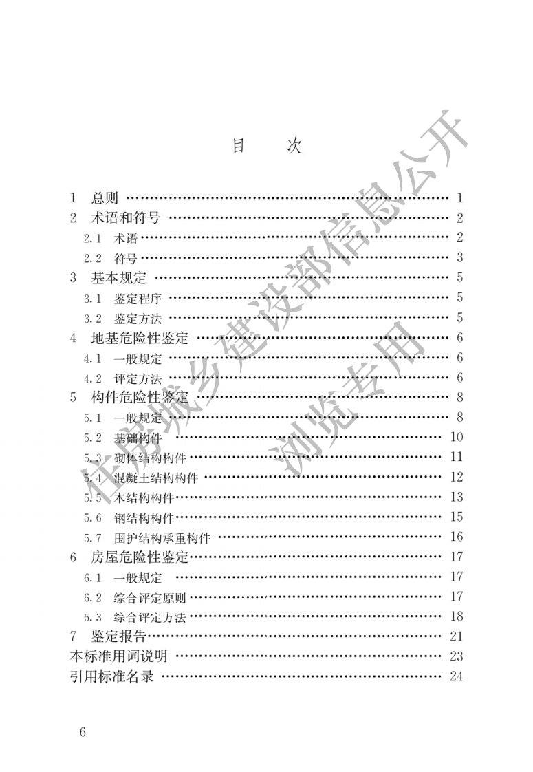 前言根据住房和城乡建设部《关于印发〈2011年无程建设标准规范制订、修订计划〉的通知》(建标[201]1?号)的要求,标准编制组经广泛调查研究,认真总结实践经验,参考有关国际标准和国内先进标准,并在广泛征求意见的基础上,修订了本标准。本标准的主要技术内容是:1总则;2术语和符号;3基本规定;4地基危险性鉴定;5构件危险性鉴定;6房屋危险性鉴定;7鉴定报告。本标准修订的主要技术内容是:1增加了术语;?修订了鉴定方法,将原标准三层次的评定方法改为两阶段三层次评定方法;3增加了地基危险性鉴定的内容,将地基与基础构件的危险性分开进行鉴定,4增加了根据房屋建造年代对构件承载力计算时抗力与效应比的调整系数;对构件危险性鉴定,完善了单个构件划分的相关规定,增加了围护结构承重构件的危险性鉴定内容,完善了对各种类型构件危险状态的评定标准;5修订了原标准的综合评判方法,采用分层危险性鉴定及整体结构危险构件综合比例鉴定法代替了原标准的模糊综合评判法,同时增加了对传力体系简单的两层及两层以下房屋的直接鉴定法;6将原标准附录A(鉴定报告)的内容调整至新增的第7章鉴定报告中,提出了存在危险构件房屋和评定为局部危房或整幢危房的房屋的原则性处理建议。本标准中以黑体字标志的条文为强制性条文,必须严格执行。本标准由住房和城乡建设部负责管理和对强制性条文的解释,由上海市房地产科学研究院负责具体技术内容的解释。执行