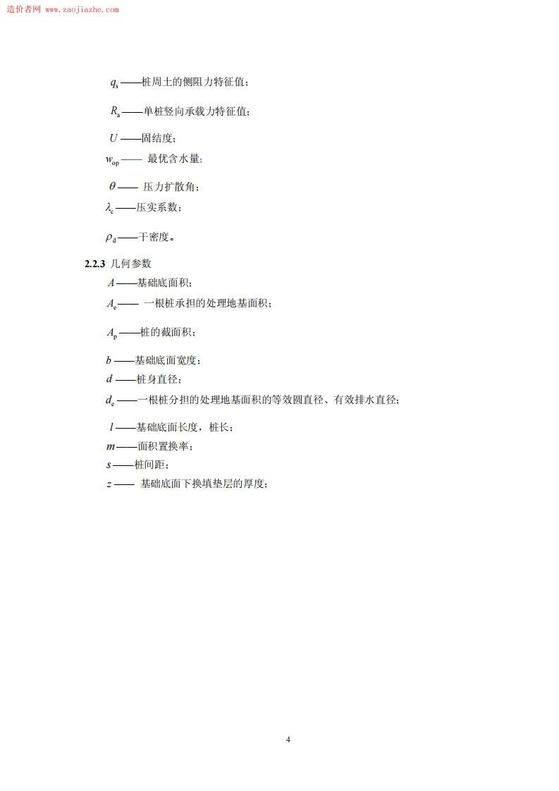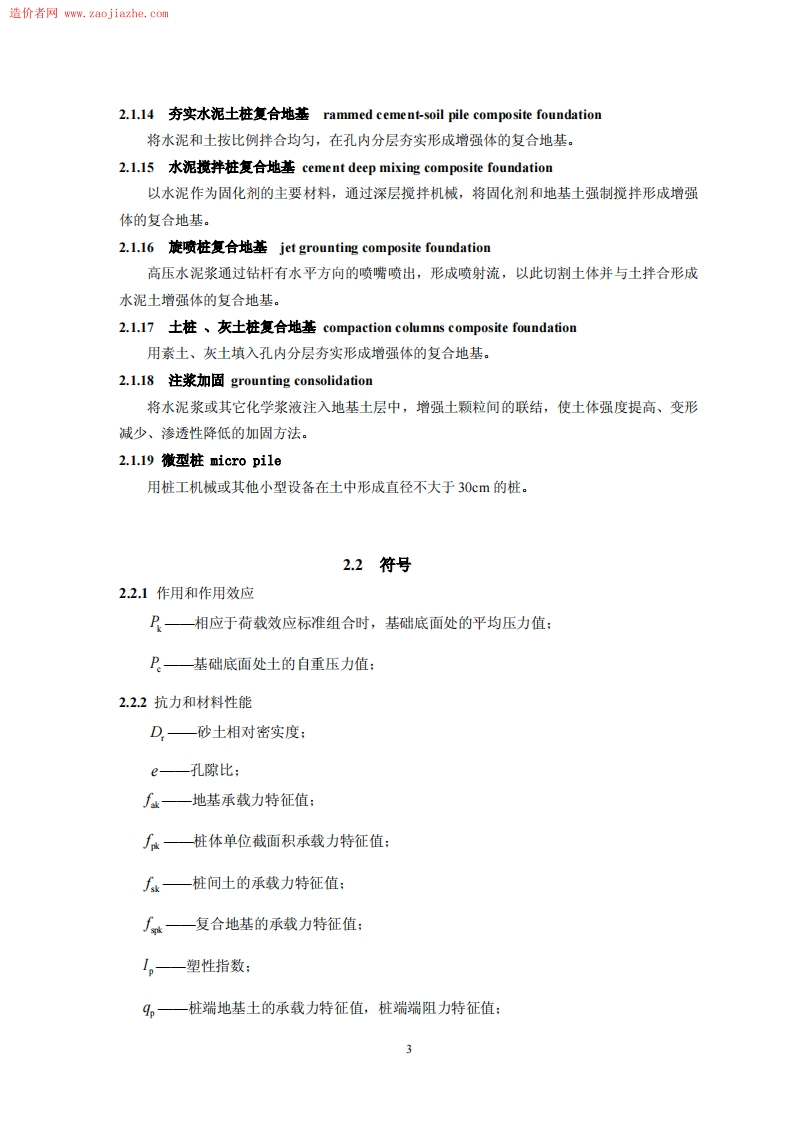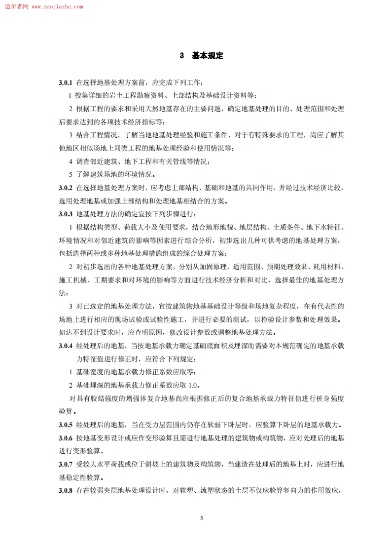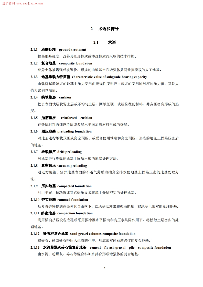 造价者网www.zaojia2he,co1总则1.0.1为了在地基处理的设计和施工中贯彻执行国家的技术经济政策,做到安全适用、技术先进、经济合理、确保质量、保护环境,制定本规范。1.02本规范适用于建筑工程地基处理的设计、施工和质量检验。1.03地基处理除应满足工程设计要求外,尚应做到因地制宜、就地取材、保护环境和节约资源等。1.04建筑工程地基处理除应执行本规范外,尚应符合国家现行的有关强制性标准的规定。经处理后的地基计算时,尚应符合现行国家标准《建筑地基基础设计规范》GB50007的有关规定。
