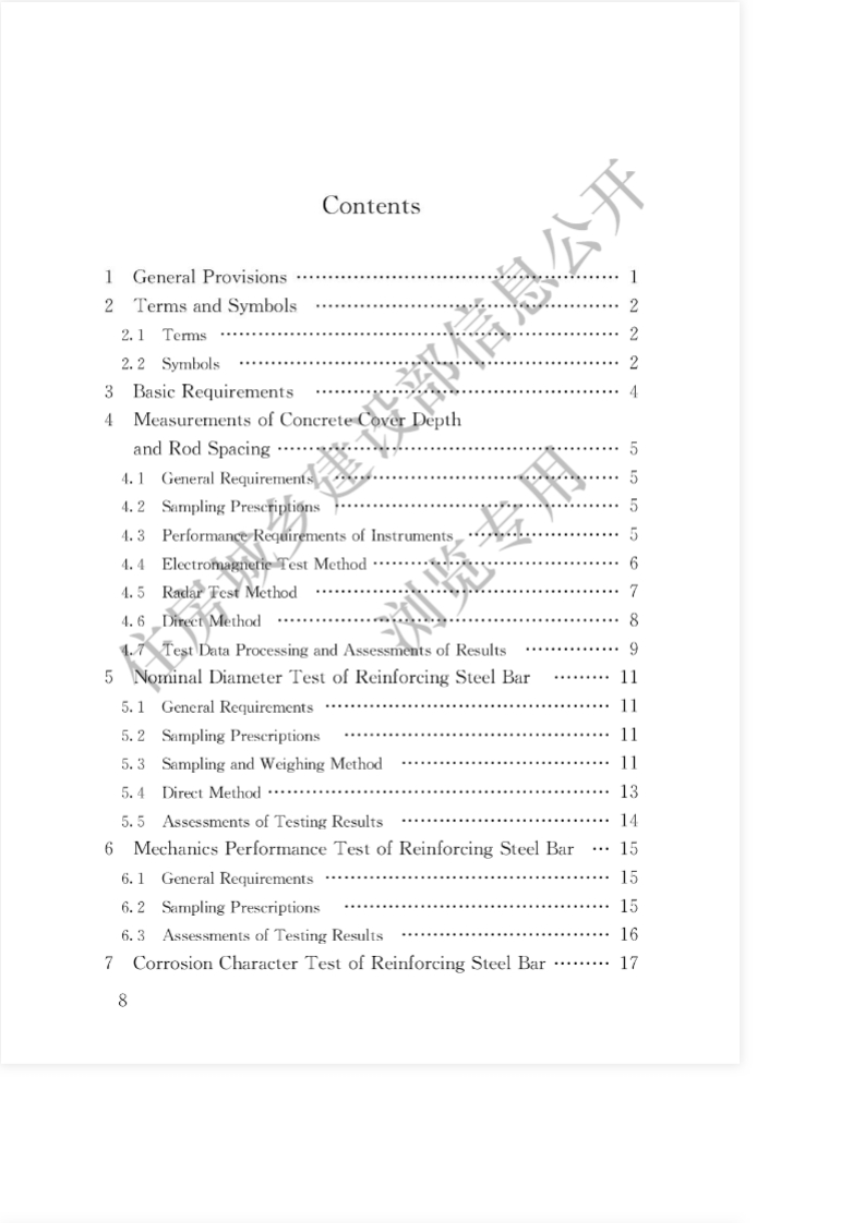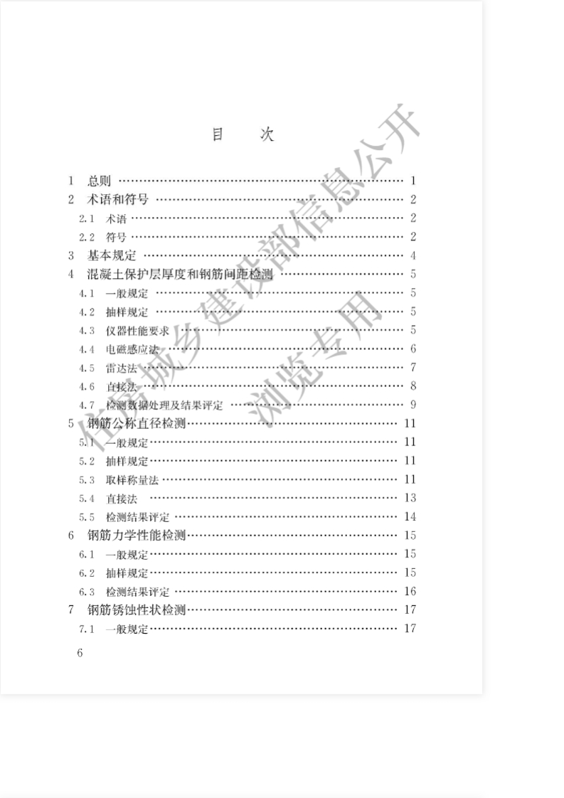 前言根据住房和城乡建设部《关于印发〈2015年无程建设标准规范制订、修订计划〉的通知》(建标[201妇189号)的要求,标准编制组经广泛调查研究,认真总结实践经验,参考有关国际标准和国外先进标准,并在广泛征求意见的基础上,修订了本标准。本标准的主要技术内容是:总则:2术语和符号;3基本规定;4混凝土保护层厚度和钢筋间距检测:5钢筋公称直径检测;6钢筋力学性能检测;⑦钢筋锈蚀性状检测;8钢筋锈蚀性状监测;9基桩钢筋笼长度检测。本次修订的主要技术内容是:1增加了取样称量法检测钢筋公称直径;2取消了电磁感应法检测钢筋公称直径;3增加了钢筋力学性能检测:4增加了钢筋锈蚀性状监测;5增加了磁测井法检测基桩钢筋笼长度。本标谁由住房和城乡建设部负责管理,由中国建筑科学研究院负责具体技术内容的解释。执行过程中如有意见或建议,请寄送中国建筑科学研究院(地址:北京市北三环东路30号,邮政编码:100013)。本标准主编单位:中国建筑科学研究院福州市一建建设股份有限公司本标准参编单位:福建省建筑科学研究院安徽省(水利部淮河水利委员会)水利科学研究院山东省建筑科学研究院台州市建设工程质量检测中心中交公路规划设计院有限公司4