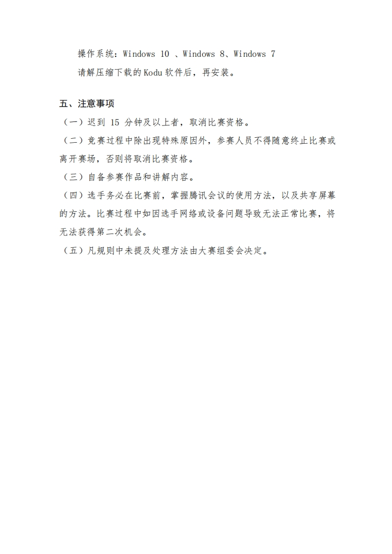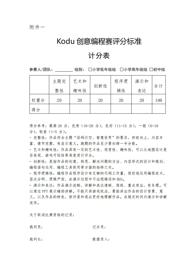 2021-2022全国青少年电子信息智能创新大赛复赛赛项规则一Kodu创意编程赛一、比赛题目及形式(一)主题:“添码行空,智惠世界”可围绕主题展开想象力,提前设计相关作品。例如:环保、太空探索、抗疫、能源、运输、人工智能、冬奥会等各种与主题相关的作品(不限于上述示例)。要体现主题中“利用智慧和智能技术惠及世界”的核心。(二)形式个人赛,在线演示、讲解与答辩。(三)分组比赛分为小学低年级组(1-3年级)、小学高年级组(4-6年级)、初中组。各个组别的比赛题目和形式相同,评分仅在本组别内决定选手在该组别的名次。二、比赛内容比赛总时间为8分钟(演示讲解5分钟,答辩3分钟)。每个选手演示和讲解所制作的作品。在比赛时间内,不得修改作品结构及功能,直至展示讲解与答辩结束或时间终止结束,完成比赛任务,比赛成绩取平均分为最终成绩。三、任务流程(一)登录腾讯会议软件,准备在线演示和讲解