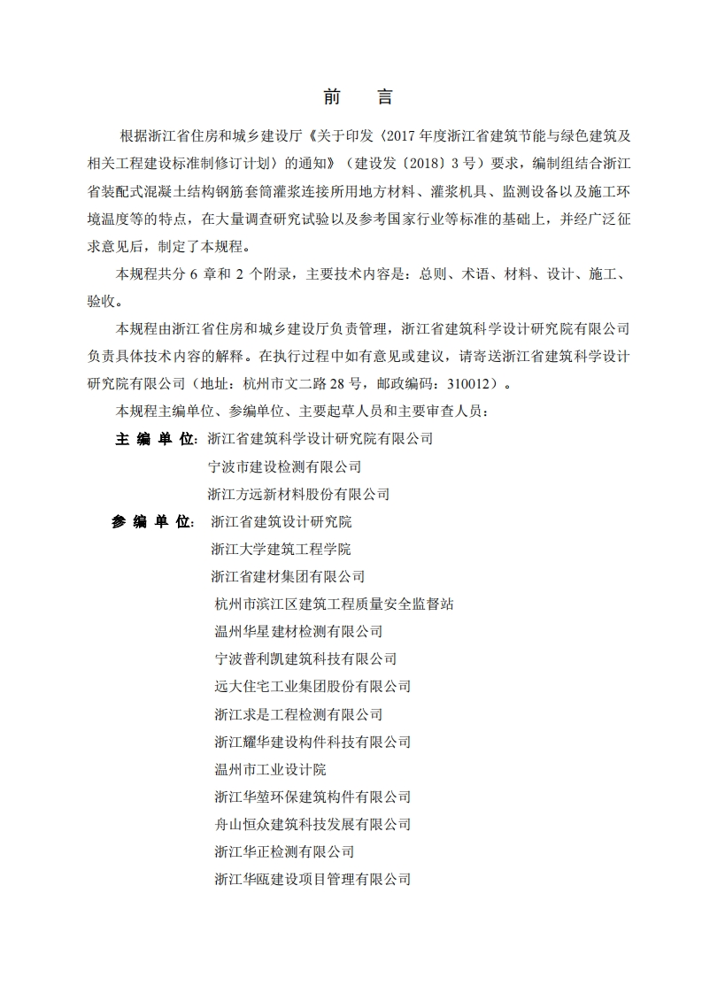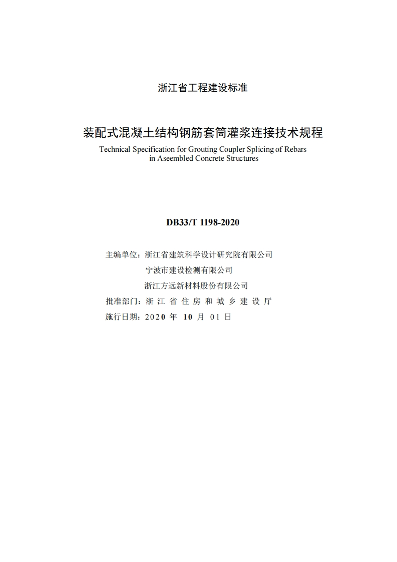 _式混凝土结构钢筋套筒灌浆连接技术规hnicalSpecificationforGroutingCouplerSplicingofRebarsinAseembledConcreteStructures(发布稿)348072@abc15天前发布关注私信1.19MB55页029_式混凝土结构钢筋套筒灌浆连接技术规hnicalSpecificationforGroutingCouplerSplicingofRebarsinAseembledConcreteStructures(发布稿)此内容为付费资源,请付费后查看¥23¥36黄金会员免费钻石会员免费立即购买您当前未登录!建议登陆后购买,可保存购买订单付费资源 第1页 / 共55页 第2页 / 共55页 第3页 / 共55页 第4页 / 共55页 第5页 / 共55页 试读已结束,还剩50页,您可下载完整版后进行离线阅读 THE END标准规范 文本预览 备案号:正在报建设部备案中DB浙江省工程建设标准DB33/T1198-2020装配式混凝土结构钢筋套筒灌浆连接技术规程Technical Specification for Grouting Coupler Splicing of Rebarsin Aseembled Concrete Structures(发布稿)2020-04-07发布2020-10-01施行浙江省住房和城乡建设厅发布 查看更多 收起部分 喜欢就支持一下吧收藏