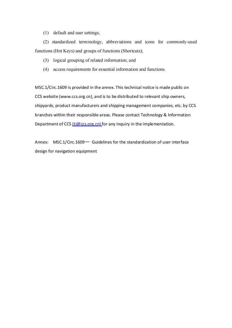 CCSTechnical Information(2020)Technical Information No.7 Total No.441Jan.16,2020(Total 2 pages+Annex)To:Relevant shipowners,ship management companies,shipyards and designers,productmanufacturer,related departments of the Headquarters of CCS,the Society's surveyors,Plan Approval CentersTechnical notice on MSC.1-Circ.1609-Guidelines for theStandardization of User Interface Design for Navigation EquipmentIssued by IMO1.BackgroundThe Maritime Safety Committee of International Maritime Organization (IMO),at its101st session in 14 June 2019,approved Guidelines for the standardization of userinterface design for navigation equipment by means of MSC.1/Circ.1609.The aim of these Guidelines is to promote standardization of user interfaces to helpmeet user needs.Improved standardization of the user interface and information usedby seafarers to monitor,manage and perform navigational tasks will enhance situationawareness and improve safety of navigation.2.Main contentsThese Guidelines apply to Integrated Navigation Systems (INS),Electronic ChartDisplay and Information Systems(ECDIS)and radar equipment.They may also beapplied to other electronic navigation equipment,and navigation sensors,whereapplicableThese Guidelines specify the standardization design principles for electronicnavigation equipment,and based on these principles,four appendixes are developed: