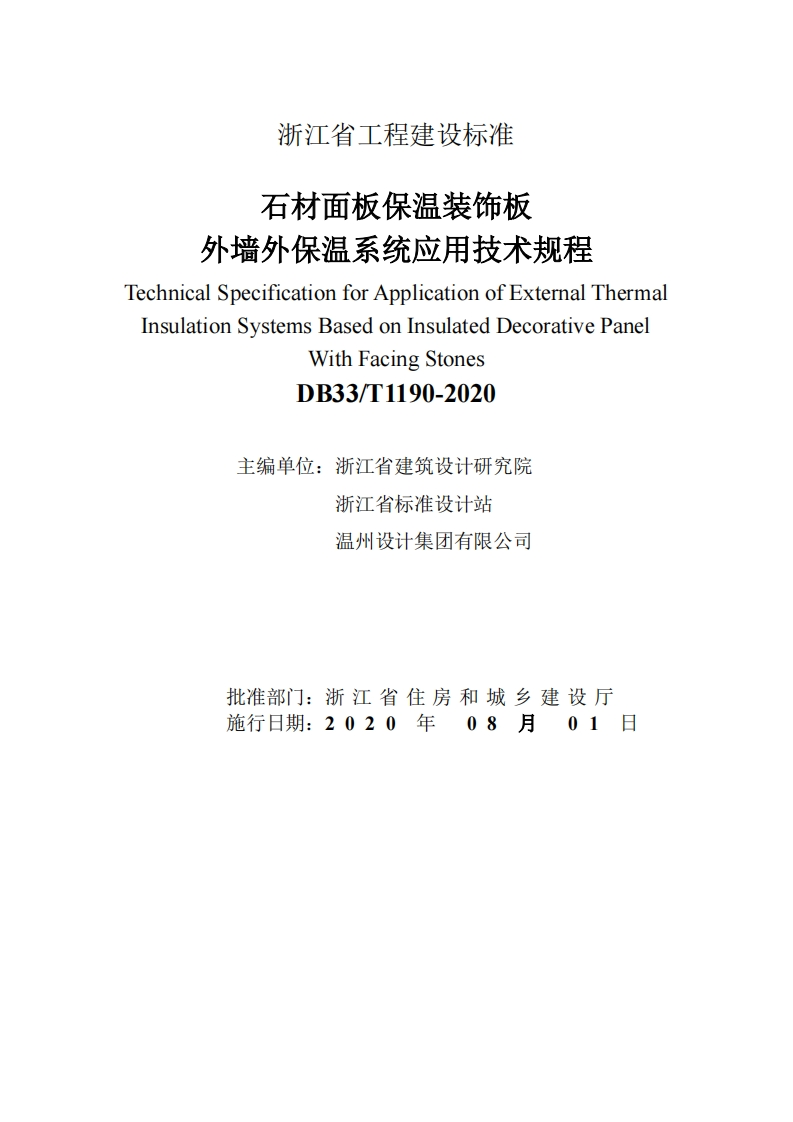 备案号:正在报建设部备案中DB浙江省工程建设标准DB33/T1190-2020石材面板保温装饰板外墙外保温系统应用技术规程Technical Specification for Application of External ThermalInsulation Systems Based on Insulated Decorative PanelWith Facing Stones(发布稿)2020-03-05发布2020-08-01实施浙江省住房和城乡建设厅发布