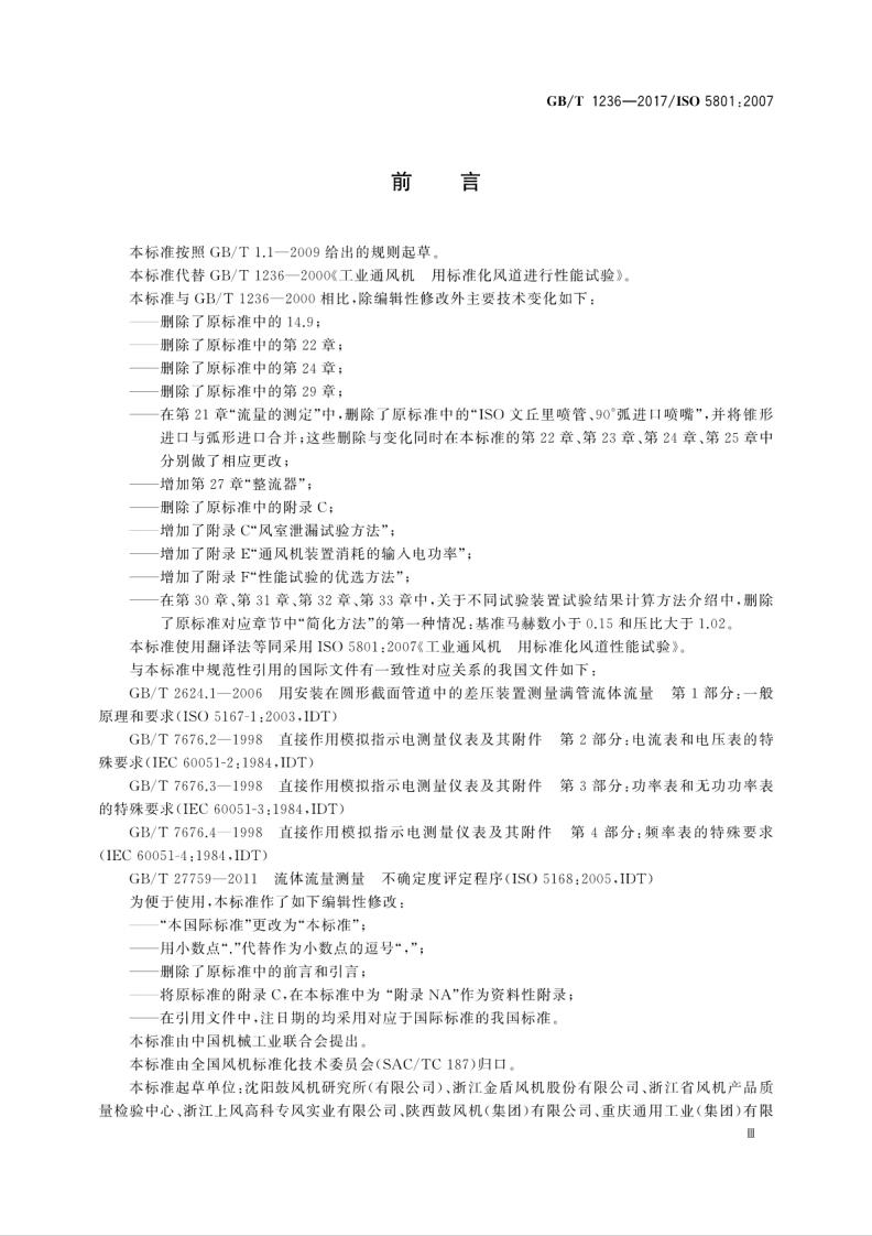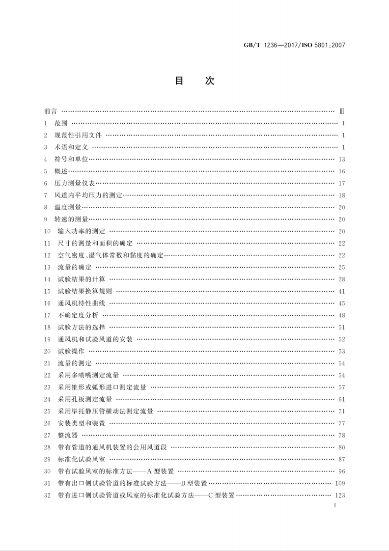 1CS23.120J72中华人民共和国国家标准GB/T1236-2017/IS05801:2007代替GB/T1236一2000工业通风机用标准化风道性能试验Industrial fan-Performance testing using standardized airways(IS05801:2007,IDT)2017-11-01发布2018-05-01实施中华人民共和国国家质量监督检验检疫总局中国国家标准化管理委员会发布