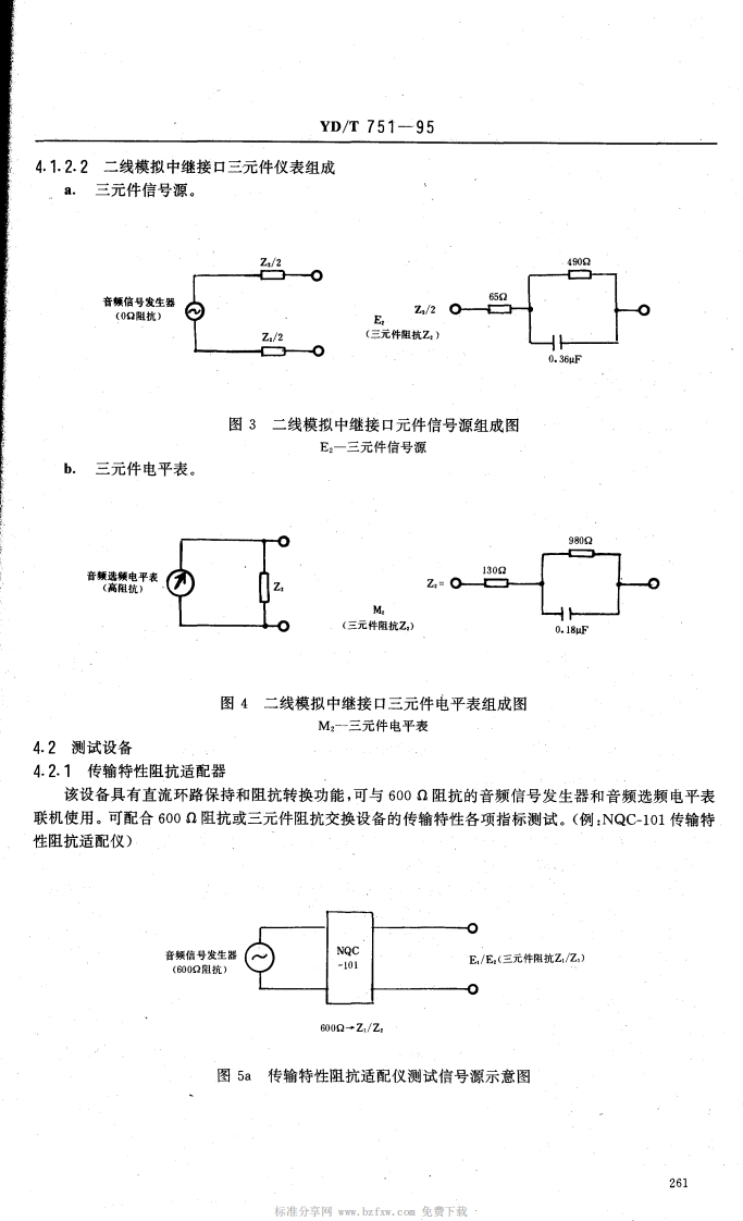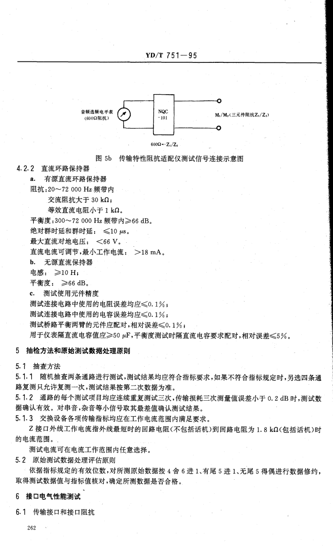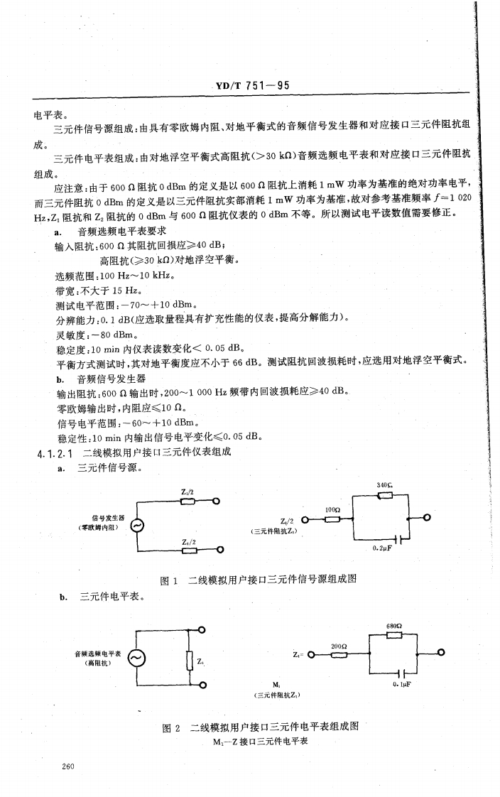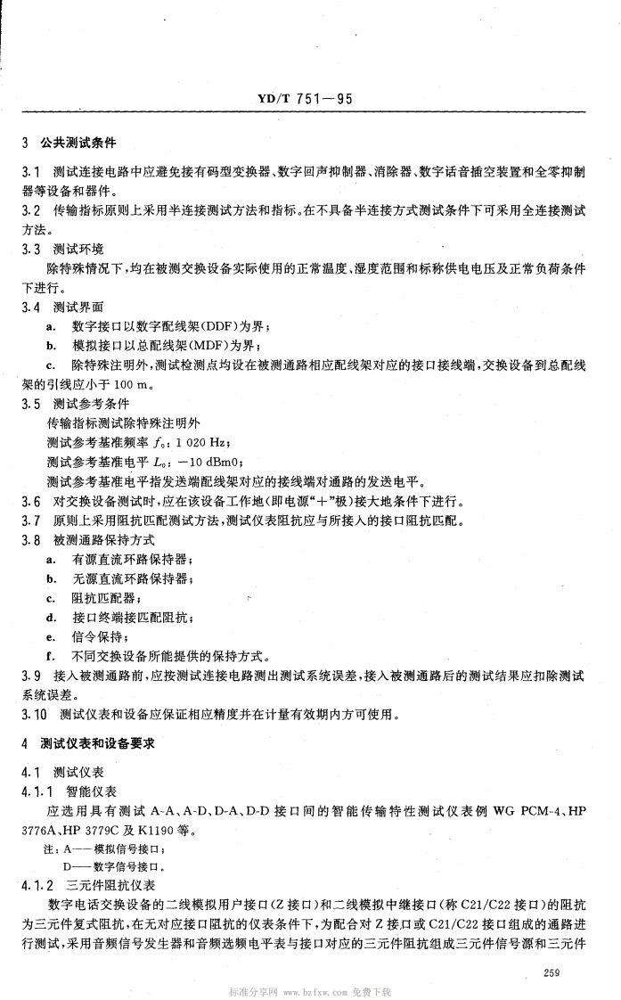 中华人民共和国通信行业标准公用电话网局用数字电话交换设备YD/T751-95进网检测方法1主题内容和适用范围1.1主题内容本标准规定了公用电话网局用数字电话交换设备的公共测试条件,测试仪表和设备要求,测试环境及抽样办法,各类技术指标和功能的检测方法,以及用户信号方式,局间信号方式和同步性能的检测方法。同时,规定了原始测试数据处理和评估原则。1.2适用范围本标准适用于数字程控电话终端局、汇接局、长市合一局、长市农合一局、长途局和国际出口局交换设备的进网检测和网上质量监督检查,并适用于数字程控电话交换设备生产和鉴定检测。2引用标准GB3376电话自动交换网带内单颜脉冲线路信号方式GB3377电话自动交换网多频记发器信号方式GB3378。电话自动交换网用户信号方式GB3379电话自动交换网局间直流信号方式GB3380电话自动交换网铃流和信号音GB3971.2电话自动交换网局间中继数字型线路信号方式GB/T3971.3电话自动交换网多频记发器信号技术指标测试方法GB/T5442电话自动交换网带内单频脉冲线路信号技术指标测试方法GB/T5444.电话自动交换网用户信号技术指标测试方法GB68792048kbit/s30路脉码调制复用设备技术要求GB12048数字网内时钟和同步设备的进网要求GF002-9002.1邮电部电话交换设备总技术规范书电话自动交换网技术体制(试行)大、中城市数、模混合网技术体制(暂行规定)CCITT相关建议红皮书Q.501-507Q.511-517CCITT相关建议蓝皮书Q.500Q.511-513Q.521-522Q.541-544Q.551-554中华人民共和国邮电部1995-06-02批准1995-11-01实施258