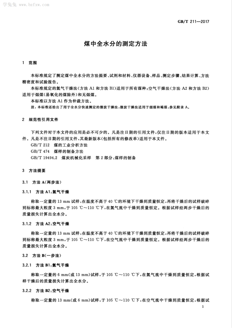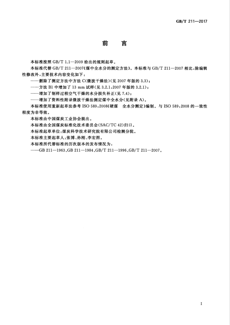 1Cs73.040D21GB中华人民共和国国家标准GB/T211-2017代替GB/T211-2007煤中全水分的测定方法Determination of total moisture in coal(ISO 589:2008,Hard coal-Determination of total moisture,NEQ)2017-09-07发布2018-04-01实施中华人民共和国国家质量监督检验检疫总局中国国家标准化管理委员会发布
