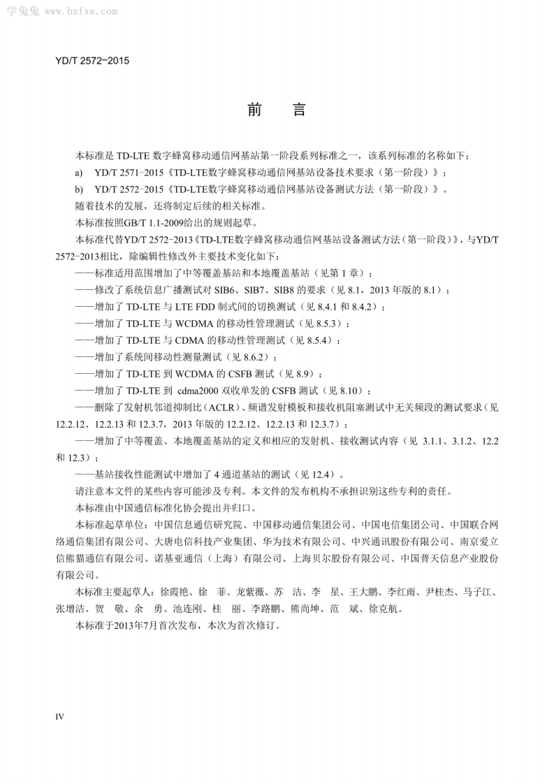 1CS33.060.99M36YD中华人民共和国通信行业标准YD/T2572-2015代替YD/T2572-2013TD-LTE数字蜂窝移动通信网基站设备测试方法(第一阶段)TD-LTE digital cellular mobile telecommunication network-Test method of eNodeB Equipment (Phase 1)2015-07-14发布2015-10-01实施中华人民共和国工业和信息化部发布