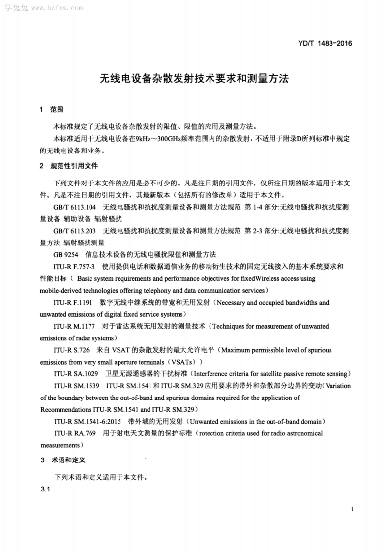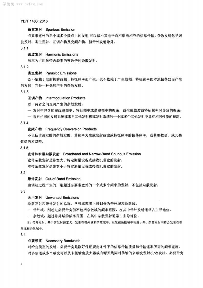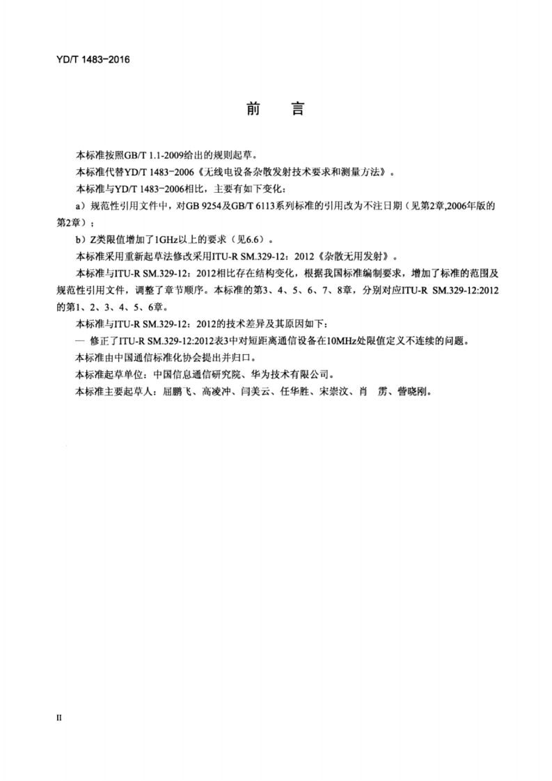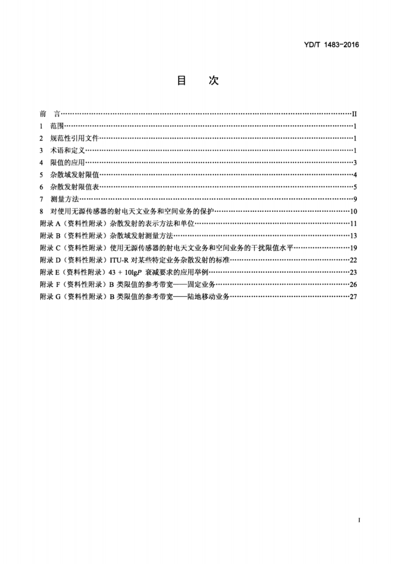 1CS33.100M04YD中华人民共和国通信行业标准YD/T1483-2016代替YD/T1483-2006无线电设备杂散发射技术要求和测量方法Technical requirement and measurement method ofspurious emission of radio equipment(ITU-R SM.329-12:2012,Unwanted Emissions in the Spurious Domain,MOD)2016-04-05发布2016-07-01实施中华人民共和国业和信息化部发布