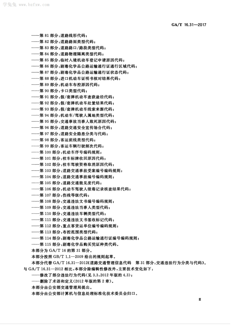 ICS35.040R85GA中华人民共和国公共安全行业标准GA/T16.31-2017代替GA/T16.31-2012道路交通管理信息代码第31部分:交通违法行为类别代码Information codes for road traffic management-Part 31:Codes for classification of traffic violation actions2017-04-17发布2017-04-17实施中华人民共和国公安部发布