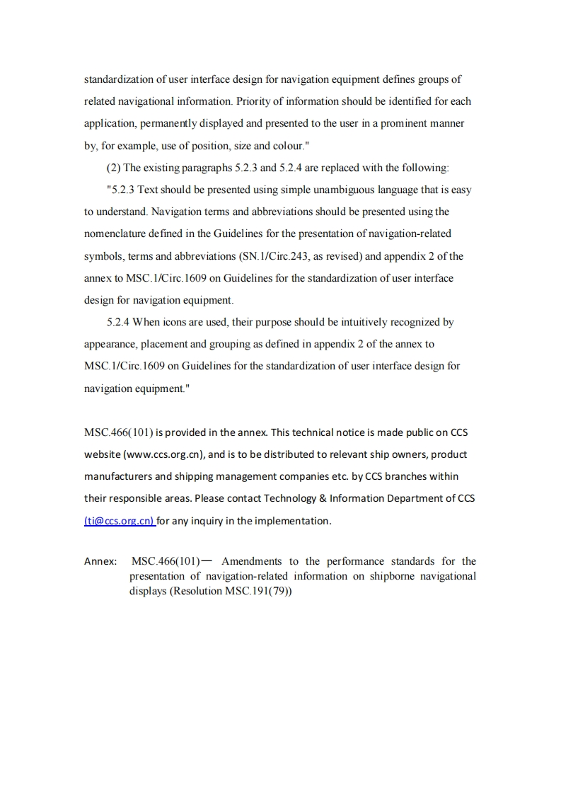 CCSTechnical Information(2020)Technical Information No.4 Total No.438Jan.13,2020(Total 2 pages+Annex)To:Relevant shipowners,ship management companies,shipyards and designers,relateddepartments of the Headquarters of CCS,the Society's surveyors,Plan Approval Centers,Technical notice on MSC.466(101)issued by IMO to amend theperformance standards for the presentation of navigation-relatedinformation on shipborne navigational displays MSC.191(79))1.BackgroundThe Maritime Safety Committee of International Maritime Organization (IMO),at its101st session in 14 June 2019,adopted amendments to the performance standards forthe presentation of navigation-related information on shipborne navigational displays(Resolution MSC.191(79))by means of Resolution MSC.466(101).This resolution is to be applied to shipborne navigational displays on the bridge of aship for radar equipment,electronic chart display and information systems(ECDIS)and integrated navigation systems (INS)installed on or after 1 January 2024 and allother navigational displays on the bridge of a ship installed on or after I July 2025.2.Main contentsSection 5 of MSC.191(79)on General requirements for the presentation ofinformation are revised as follows:(1)The existing paragraph 5.1.1 is replaced with the following"5.1.1 The presentation of information should be consistent with respect toscreen layout and arrangement of information.Data and control functions should belogically grouped.Appendix 3 of the annex to MSC.1/Circ.1609 on Guidelines for the