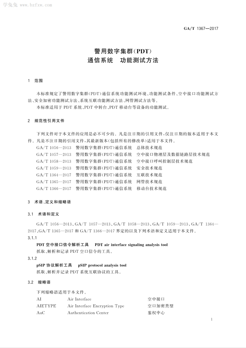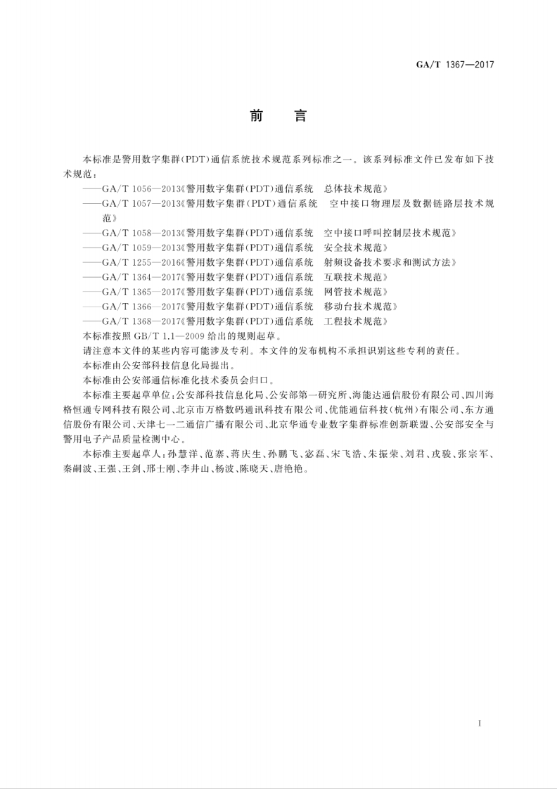 中华人民共和国_中华人民共和国_警用数字集群(PDT)通信系统功能测试方法Policedigitaltrunkingcommunicationsystemmeasurementmethodsforfunction348072@abc14天前发布关注私信12.04MB148页027中华人民共和国_中华人民共和国_警用数字集群(PDT)通信系统功能测试方法Policedigitaltrunkingcommunicationsystemmeasurementmethodsforfunction此内容为付费资源,请付费后查看¥23¥36黄金会员免费钻石会员免费立即购买您当前未登录!建议登陆后购买,可保存购买订单付费资源 第1页 / 共148页 第2页 / 共148页 第3页 / 共148页 第4页 / 共148页 第5页 / 共148页 试读已结束,还剩143页,您可下载完整版后进行离线阅读 THE END标准规范 文本预览 1CS33.060.01A90GA中华人民共和国公共安全行业标准GA/T1367-2017警用数字集群(PDT)通信系统功能测试方法Police digital trunking communication system-measurement methods for function2017-02-08发布2017-02-08实施中华人民共和国公安部发布 查看更多 收起部分 喜欢就支持一下吧收藏