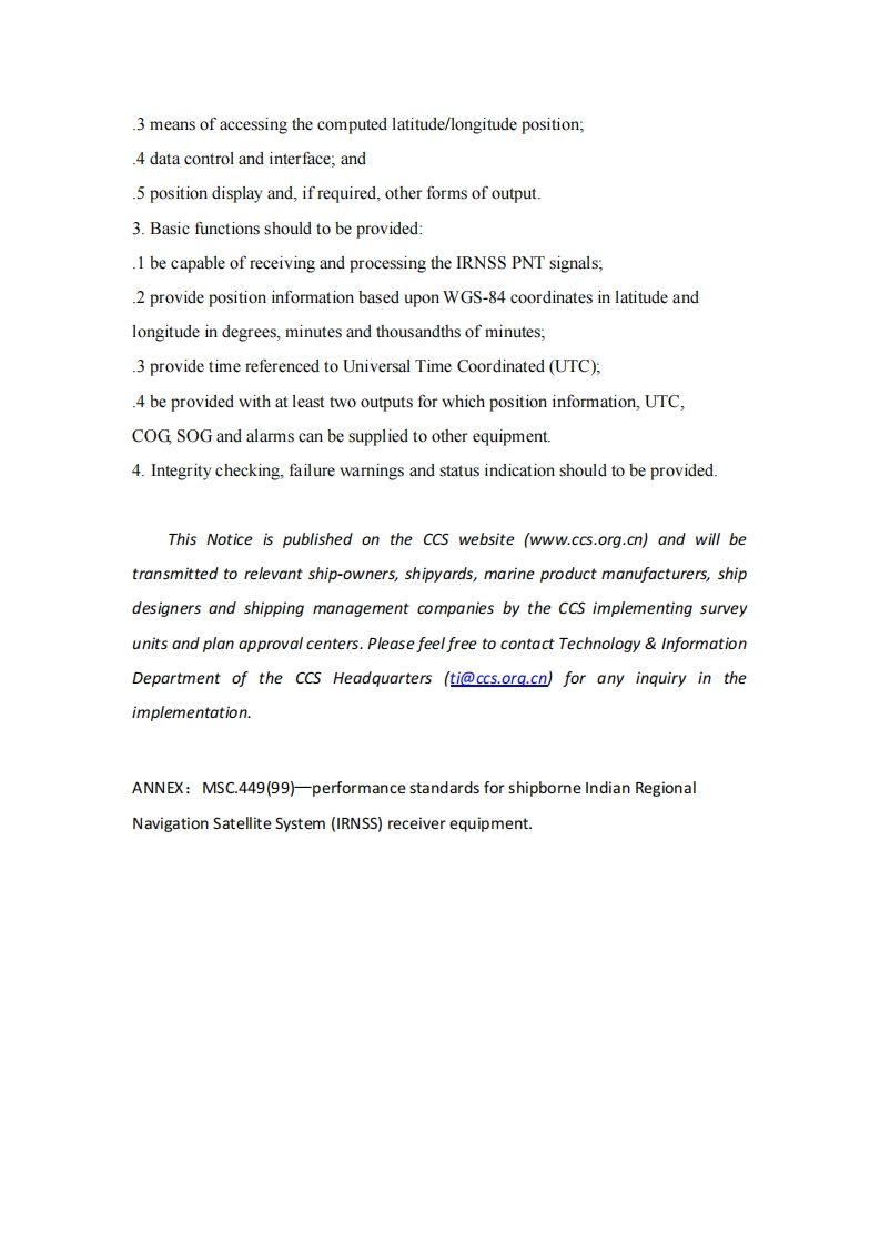 CCSTechnical Information(2021)Technical Information No.50 Total No.556Sep.13,2021(Total pages)To:Related departments in CCS Headquarters,each plan approval center,eachbranch (office),marine product manufacturers,ship-owner,etc.Technical Notice on performance standards for shipborne IndianRegional Navigation Satellite System (IRNSS)receiver equipment[MSC.449(99)]issued by IMO-BackgroundThe Maritime Safety Committee(MSC)of International Maritime Organization(IMO),at its 99th session,approved the performance standards for shipborneIndian Regional Navigation Satellite System (IRNSS)receiver equipment[MSC.449(99)】in24May2018.RECOMMENDS IRNSS receiver equipment installed on or after 1 July 2020conforms to performance standards not inferior to those specified.二.Main contentsThe resolution is newly provided,which include as follows:1.IRNSS is the regional navigation satellite system and the service is limited to thefollowing coverage area:Area closed by 55E Longitude,50N Latitude and 110ELongitude,5S Latitude2.IRNSS receiver equipment should include the following minimum facilities:.1 antenna capable of receiving IRNSS signals;.2 IRNSS receiver and processor;