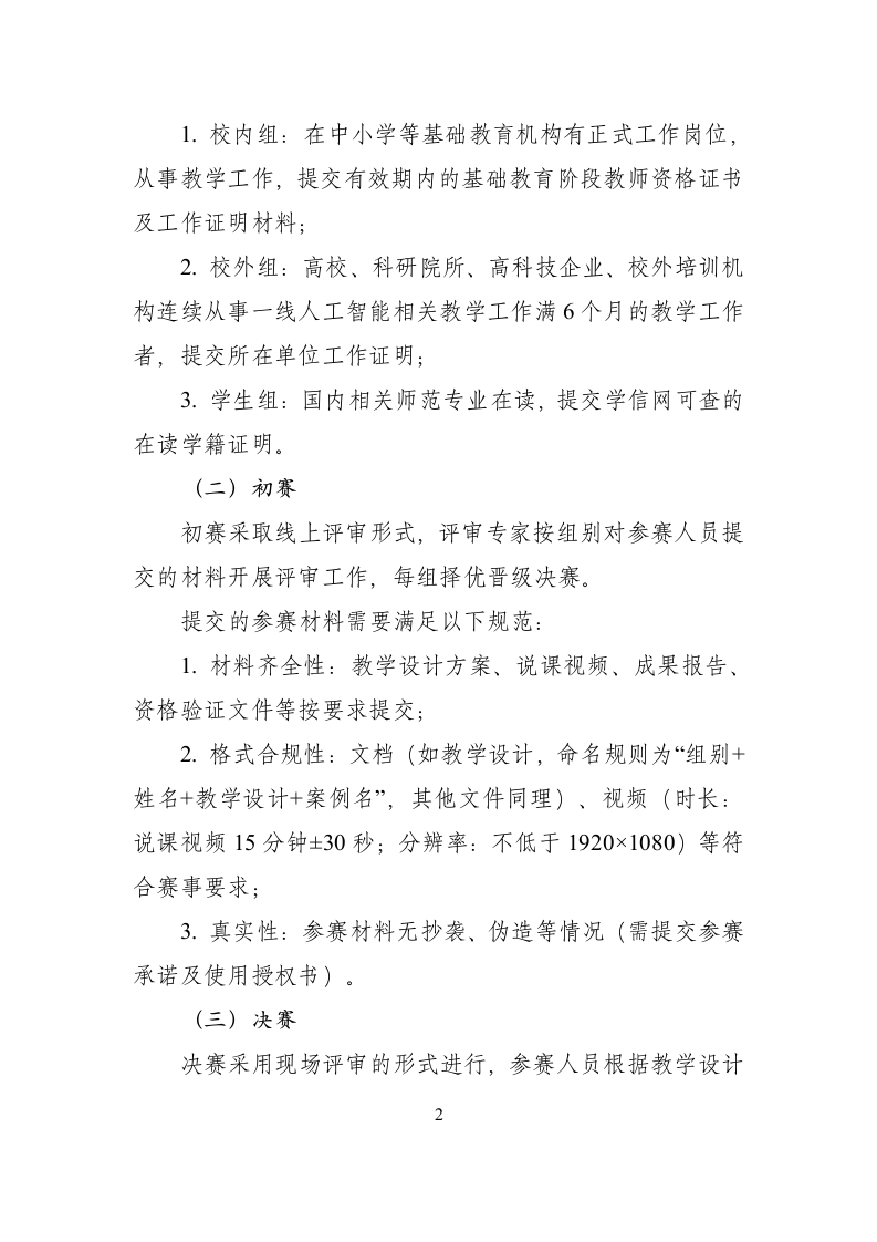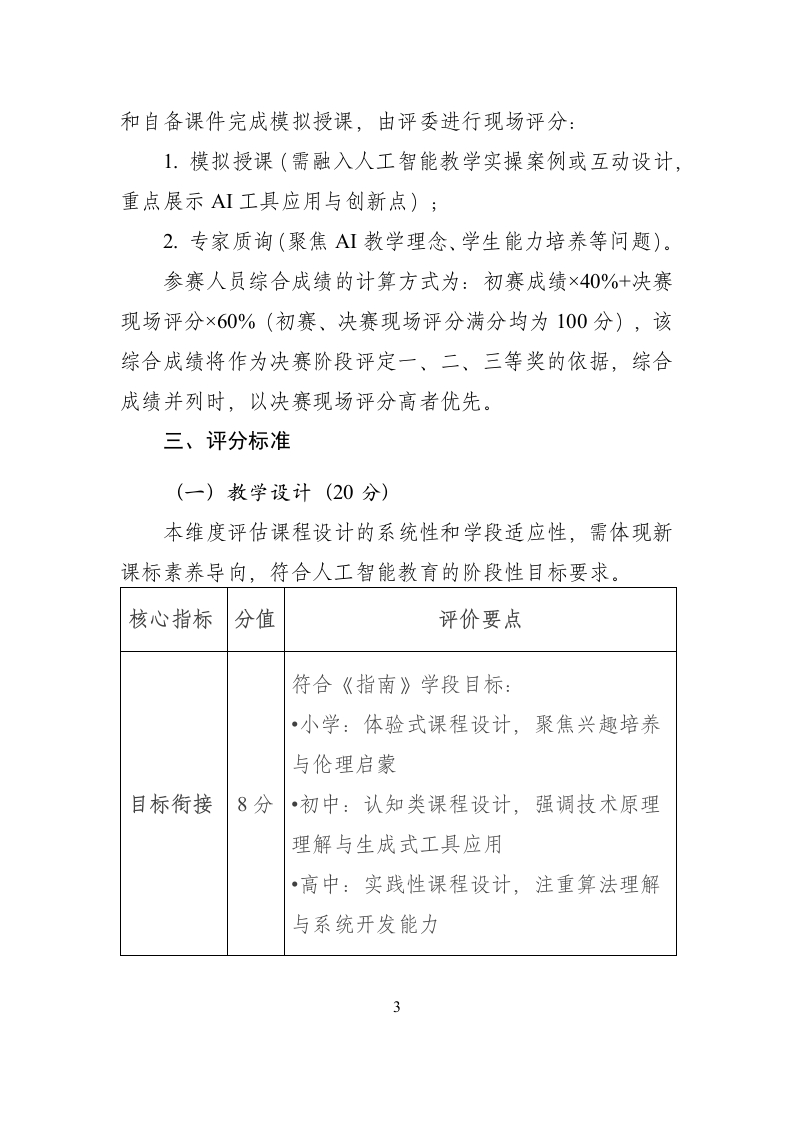 附件中小学人工智能教育教学成果大赛评分标准根据教育部《教师数字素养》《中小学人工智能通识教育指南(2025年版)X中小学生成式人工智能使用指南(2025年版)》等文件精神,参考《北京市中小学人工智能教育地方课程纲要(试行)(2025年版)》《上海市推进实施人工智能赋能基础教育高质量发展的行动方案(2024-2026年)》《广东省中小学教师人工智能素养框架》等地方实践文件,特制定大赛评分标准,确保评审工作科学、规范、贴合教育实践要求。一、组别设置大赛按人员类型设置校内组、校外组和学生组,每位参赛人员仅可选择一个组别报名。二、评审程序大赛分为资格审查、初赛、决赛三个阶段,具体组织形式如下:(一)资格审查按照参赛资格审查规定,严格审核参赛人员的身份和资质,须符合以下条件之一: