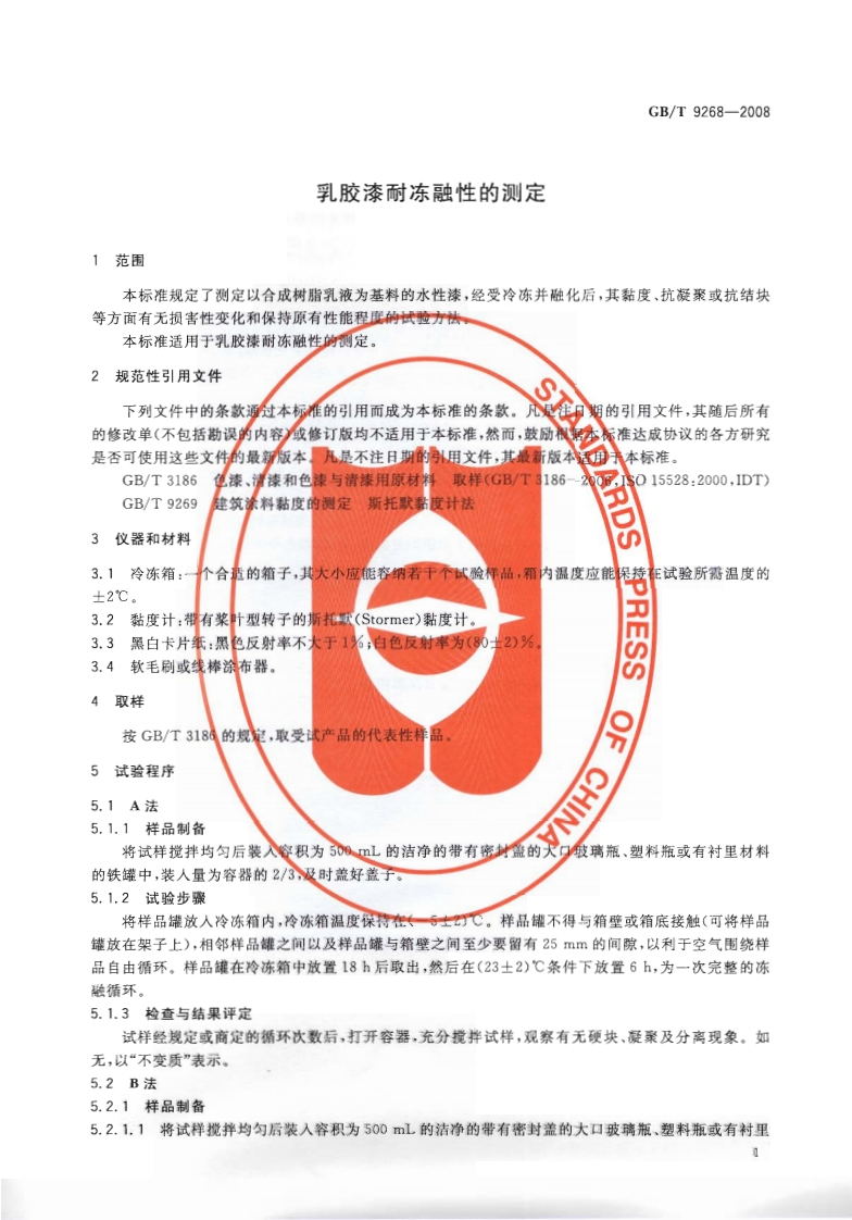 乳胶漆耐冻融性的测定Determinationoffreeze-thawresistanceoflatexandemulsionpaints348072@abc12天前发布关注私信0.24MB5页033乳胶漆耐冻融性的测定Determinationoffreeze-thawresistanceoflatexandemulsionpaints此内容为付费资源,请付费后查看¥23¥36黄金会员免费钻石会员免费立即购买您当前未登录!建议登陆后购买,可保存购买订单付费资源 第1页 / 共5页 第2页 / 共5页 第3页 / 共5页 第4页 / 共5页 第5页 / 共5页 已完成全部阅读,共5页 THE END标准规范 文本预览 ICS87.040G50中华人民共和国国家标准GB/T9268-2008代替GB/T9268一1988乳胶漆耐冻融性的测定Determination of freeze-thaw resistance of latex and emulsion paints2008-05-14发布2008-10-01实施中华人民共和国国家质量监督检验检疫总局中国国家标准化管理委员会发布 查看更多 收起部分 喜欢就支持一下吧收藏