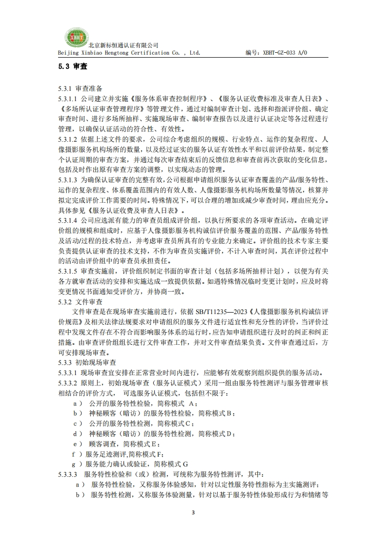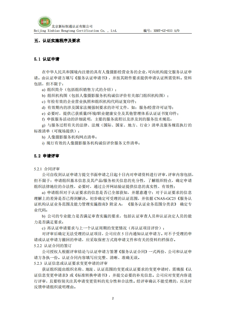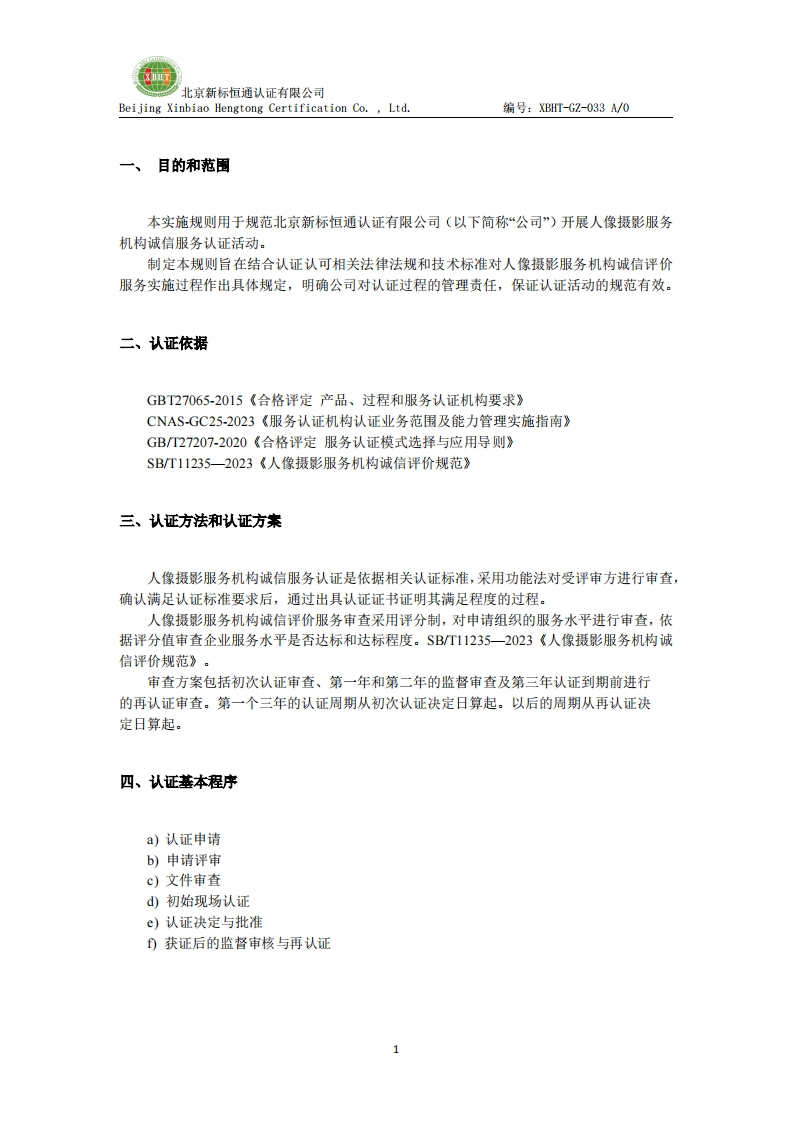 人像摄影服务机构诚信评价服务认证规则XBHT-GZ-033A_0A_1版本2025年6月10日修订348072@abc12天前发布关注私信0.25MB9页022人像摄影服务机构诚信评价服务认证规则XBHT-GZ-033A_0A_1版本2025年6月10日修订此内容为付费资源,请付费后查看¥23¥36黄金会员免费钻石会员免费立即购买您当前未登录!建议登陆后购买,可保存购买订单付费资源 第1页 / 共9页 第2页 / 共9页 第3页 / 共9页 第4页 / 共9页 第5页 / 共9页 试读已结束,还剩4页,您可下载完整版后进行离线阅读 THE END标准规范 文本预览 北京新标恒通认证有限公司Beijing Xinbiao Hengtong Certification Co.,Ltd.编号:XBHT-GZ-033A/0人像摄影服务机构诚信评价服务认证规则XBHT-GZ-033 A/0A/1版本2025年6月10日修订2025-02-28发布2025-02-28实施北京新标恒通认证有限公司发布 查看更多 收起部分 喜欢就支持一下吧收藏