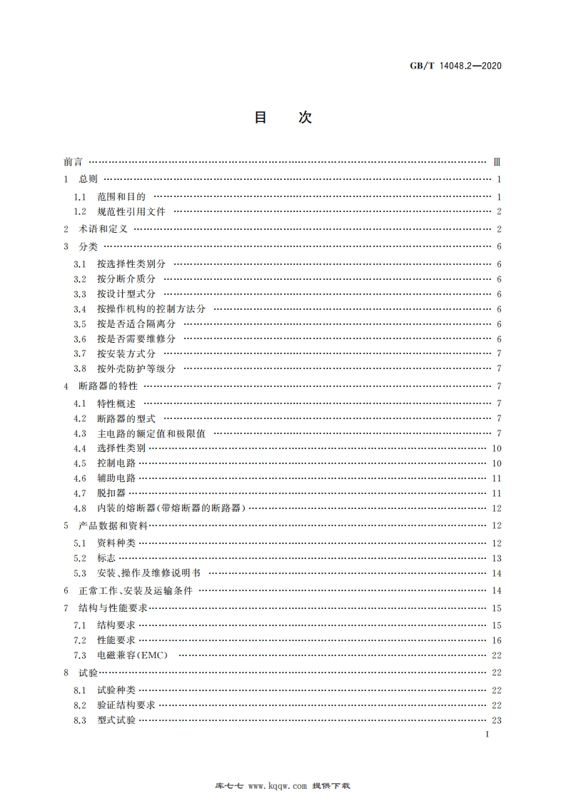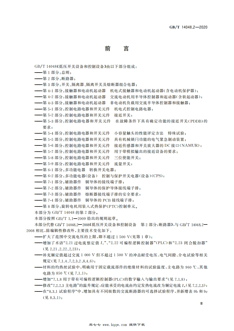 ICS29.120.40K31中华人民共和国国家标准GB/T14048.2-2020代替GB/T14048.2一2008低压开关设备和控制设备第2部分:断路器Low-voltage switchgear and controlgear-Part 2:Circuit-breakers(IEC60947-2:2019,MOD)2020-09-29发布2021-04-01实施国家市场监督管理兽局发布国家标准化管理委员会