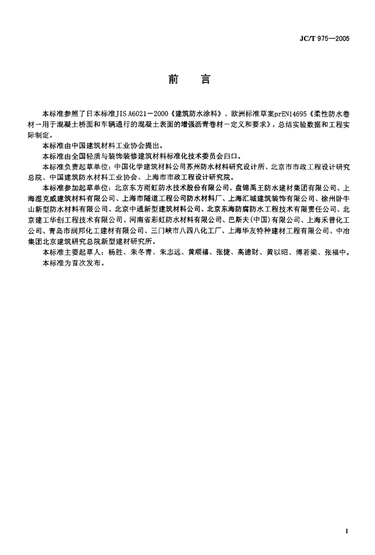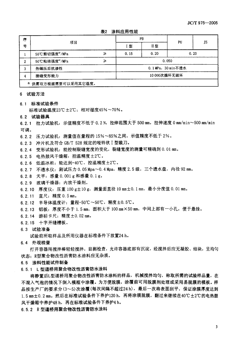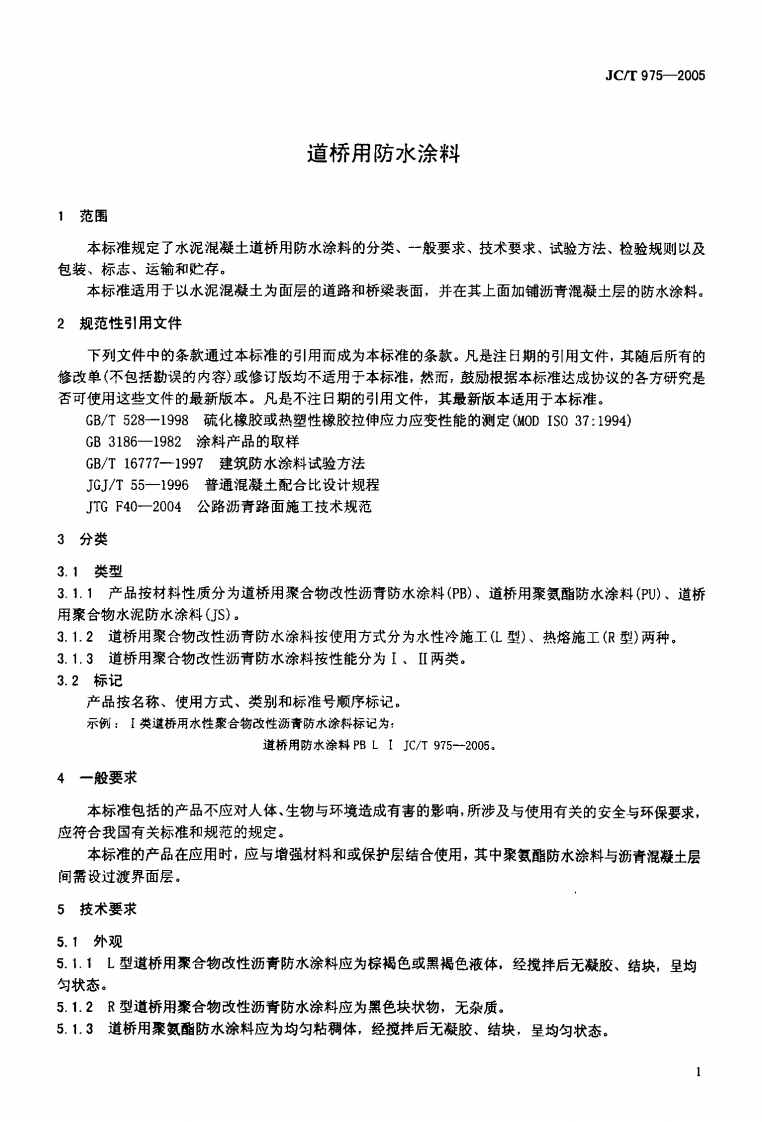 你上力水京不Waterproofingcoatingsforconcretebridgeandroadsurface-14发布2005-07-01实施华人民共和国国家发展和改革委员会发布348072@abc11天前发布关注私信0.46MB15页040你上力水京不Waterproofingcoatingsforconcretebridgeandroadsurface-14发布2005-07-01实施华人民共和国国家发展和改革委员会发布此内容为付费资源,请付费后查看¥23¥36黄金会员免费钻石会员免费立即购买您当前未登录!建议登陆后购买,可保存购买订单付费资源 第1页 / 共15页 第2页 / 共15页 第3页 / 共15页 第4页 / 共15页 第5页 / 共15页 试读已结束,还剩10页,您可下载完整版后进行离线阅读 THE END标准规范 文本预览 1CS91.120.30Q17备案号:15247一2005JC中华人民共和国建材行业标准JC/T975-2005道桥用防水涂料Waterproofing coatings for concrete bridge and road surface2005-02-14发布2005-07-01实施中华人民共和国国家发展和改革委员会发布 查看更多 收起部分 喜欢就支持一下吧收藏