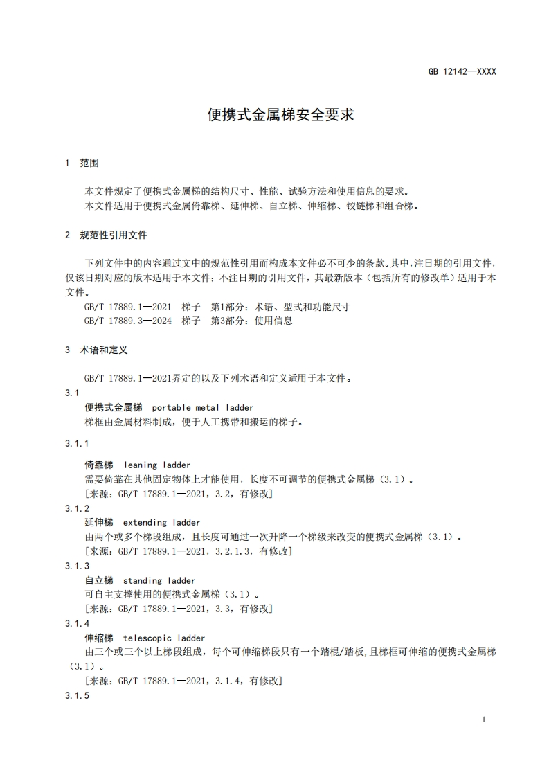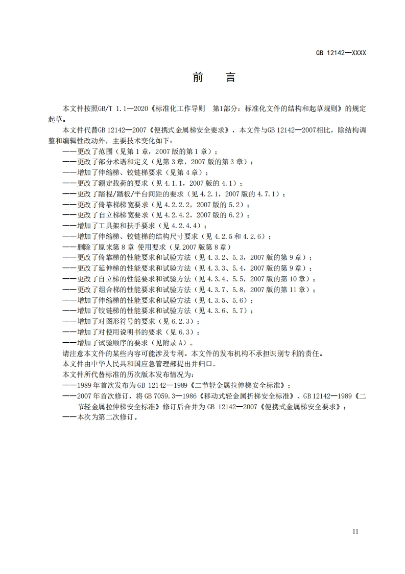 便携式金属梯安全要求Safetyrequirementsforportablemetalladders348072@abc11天前发布关注私信2.97MB50页042便携式金属梯安全要求Safetyrequirementsforportablemetalladders此内容为付费资源,请付费后查看¥23¥36黄金会员免费钻石会员免费立即购买您当前未登录!建议登陆后购买,可保存购买订单付费资源 第1页 / 共50页 第2页 / 共50页 第3页 / 共50页 第4页 / 共50页 第5页 / 共50页 试读已结束,还剩45页,您可下载完整版后进行离线阅读 THE END标准规范 文本预览 ICS13.100CCS C68GB中华人民共和国国家标准GB 12142-XXXX代替GB12142-2007便携式金属梯安全要求Safety requirements for portable metal ladders(征求意见稿)在提交反债意见时,请将您知道的相关专利连同支持性文件一并附上。XXXX-Xx-XX发布XXXX-Xx-XX实施国家市场监督管理总局发布国家标准化管理委员会 查看更多 收起部分 喜欢就支持一下吧收藏