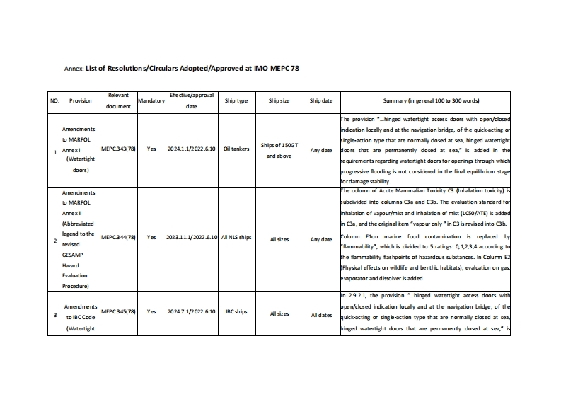 CCSTechnical Information(2022)Technical Information No.27 Total No.599Dec.01,2022(Total 11 pages)To:Relevant shipowners,ship management companies,shipyards and designers,productmanufacturer,related departments of the Headquarters of CCS,the Society's surveyors,Plan Approval CentersTechnical Notice on Resolutions/Circulars Adopted/Approved atIMO MEPC78The Maritime Environmental Protection Committee of the International MaritimeOrganization(IMO),at its 78th session,adopted 16 MEPC resolutions,includingAmendments to MARPOL Annex I(MEPC.343(78)),Amendments to MARPOL Annex ll(MEPC.344(78)),Amendments to IBC Code (MEPC.345(78)),2022 Guidelines on theMethod of Calculation of the Attained Energy Efficiency Existing Ship Index(EEXI)(MEPC.350(78))and 2022 Guidelines on Survey and Certification of the AttainedEnergy Efficiency Existing Ship Index(EEXI)(MEPC.351(78)),etc.,and approved ninecirculars including Unified Interpretations To MARPOL Annex VI(MEPC.1/Circ.795/Rev.6),Guidance on Methods,Procedures and Verification ofIn-Service Performance Measurements(MEPC.1/Circ.901)and Unified Interpretationsto the BWM Convention (BWM.2/Circ.66/Rev.3),etc..For details,please refer to the attached List of Resolutions/CircularsAdopted/Approved at IMO MEPC78.The original English version and Chinesetranslation (the English version shall prevail in case of a dispute or discrepancy)ofthese resolutions/circulars adopted/approved at IMO MEPC78 may be found in theTechnical Services /IMO&IACS information column of CCS website (www.ccs.org.cn).This Notice is made public on CCS website(www.ccs.org.cn)and is to be distributedto the shipowners,ship management companies,shipyards and marine productmanufacturers by CCS branches within their responsible areas.In case of any doubt,please contact Technology and Information Department of CCS Headquarters(ti@ccs.org.cn)Annex:List of Resolutions/Circulars Adopted/Approved at IMO MEPC 78