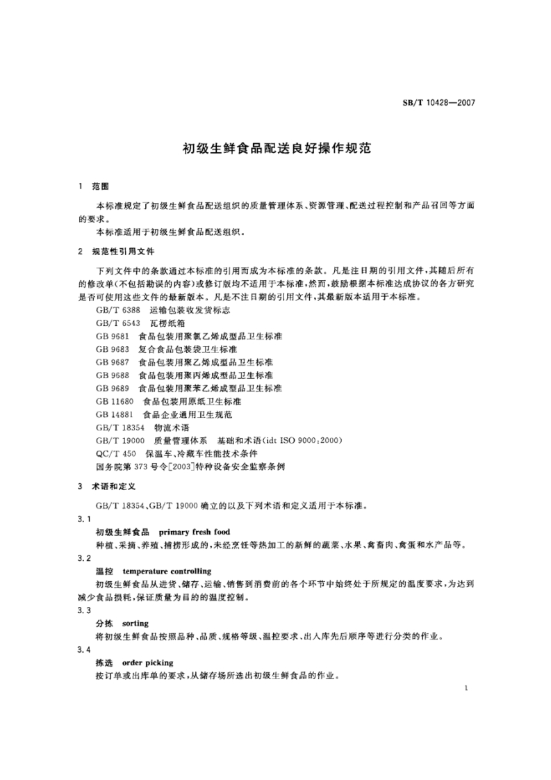 初级生鲜食品配送良好操作规范Gooddistributionpracticefortheprimaryfreshfood348072@abc9天前发布关注私信0.57MB8页026初级生鲜食品配送良好操作规范Gooddistributionpracticefortheprimaryfreshfood此内容为付费资源,请付费后查看¥23¥36黄金会员免费钻石会员免费立即购买您当前未登录!建议登陆后购买,可保存购买订单付费资源 第1页 / 共8页 第2页 / 共8页 第3页 / 共8页 第4页 / 共8页 第5页 / 共8页 试读已结束,还剩3页,您可下载完整版后进行离线阅读 THE END标准规范 文本预览 ICs67.040X09备案号:21281-2007SB中华人民共和国国内贸易行业标准SB/T10428-2007初级生鲜食品配送良好操作规范Good distribution practice for the primary fresh food2007-07-24发布2007-12-01实施中华人民共和国商务部发布 查看更多 收起部分 喜欢就支持一下吧收藏