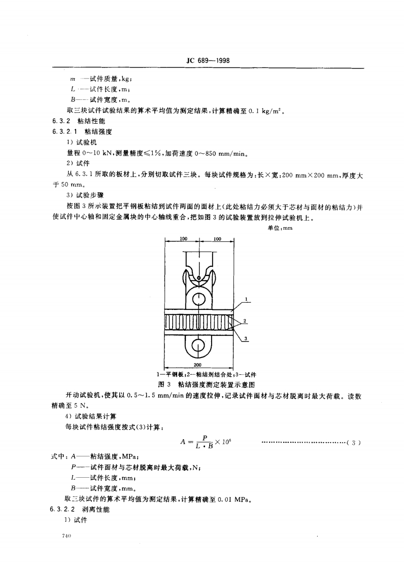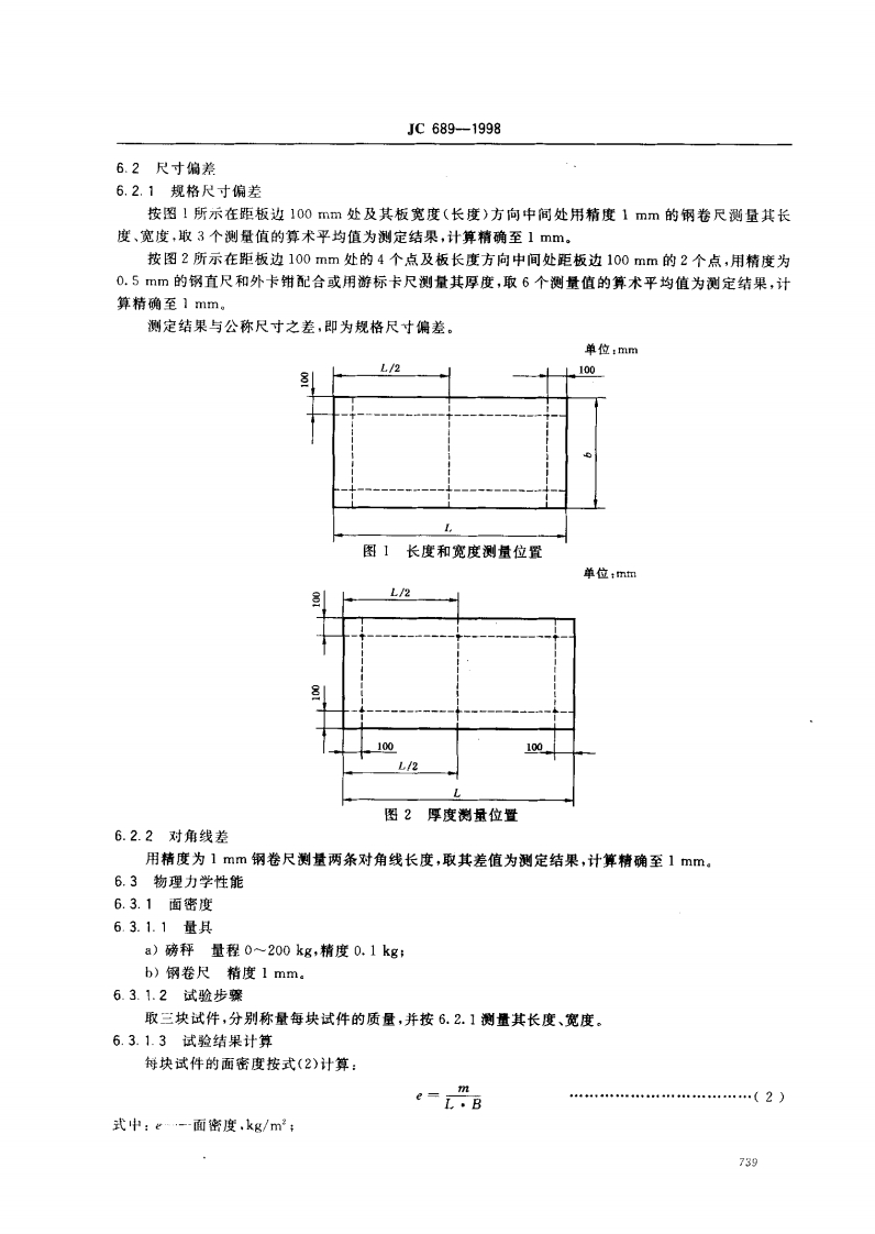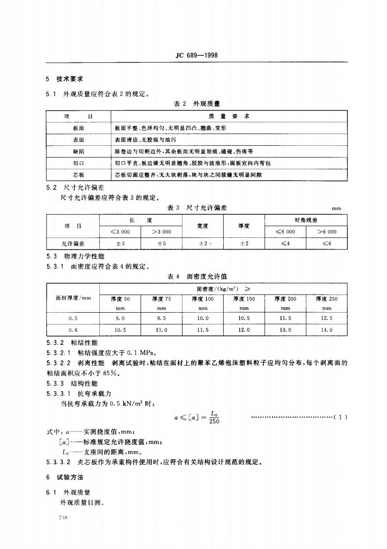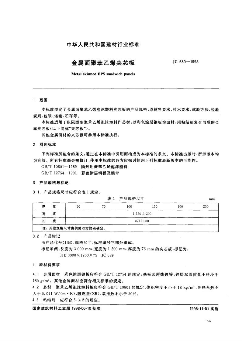 JC689-1998前言本标准是在总结金属面聚苯乙烯夹芯板十多年来生产、使用实践经验、吸取科学研究成果的基础上制定的。无同类产品的国外标准可参考。金属面聚苯乙烯夹芯板主要用于工业与民用建筑及一些商业性设施上,所以标准规定的技术要求应满足上述使用的需要,试验方法尽可能与现行的建筑构件质量评定标准相一致,以使检测结果具有科学性、准确性与可比性。本标准由全国绝热材料标准化技术委员会提出并归口。本标准由中国绝热隔音材料协会、国家建筑材料工业局标准化研究所、冶金部建筑研究总院负责起草。本标准参加起草单位:北京轻联塑料集团公司新型建材冷藏设备厂、上海晓宝轻质建材有限公司、江苏苏州工业园区新发建筑构件有限责任公司、浙江华能轻型建筑工程有限公司、浙江东阳新型建筑建材工业总公司、上海大地彩钢有限公司、云南昆明三融塑料制品有限公司、浙江上虞新型墙体材料厂、上海八一百盛空调设备有限公司、江苏连云港市新星建材厂、北京华都宝拉建筑板材有限公司、上海保成机械工业有限公司,沈阳市塑料十二厂、江苏张家港京沙钢制品有限公司、江苏宜兴市华能轻质建材有限公司、浙江杭州东南新颖建筑板材有限公司、江苏常熟常盛轻质建材厂、天津万力园实业有限公司、成都大兴轻质建材有限公司、河北省邢台晶牛公司新型建材厂、江苏武进市东宝钢结构工程有限公司、上海水明机械制造有限公司、山东晓宝轻质建材有限公司、太原市笙华轻型建材厂。本标准主要起草人:杨斌、张德信、胡小媛、谢如荣、杨洪祺、张浩东、徐伯铨、郭明明、赵焕林、庞小平。736