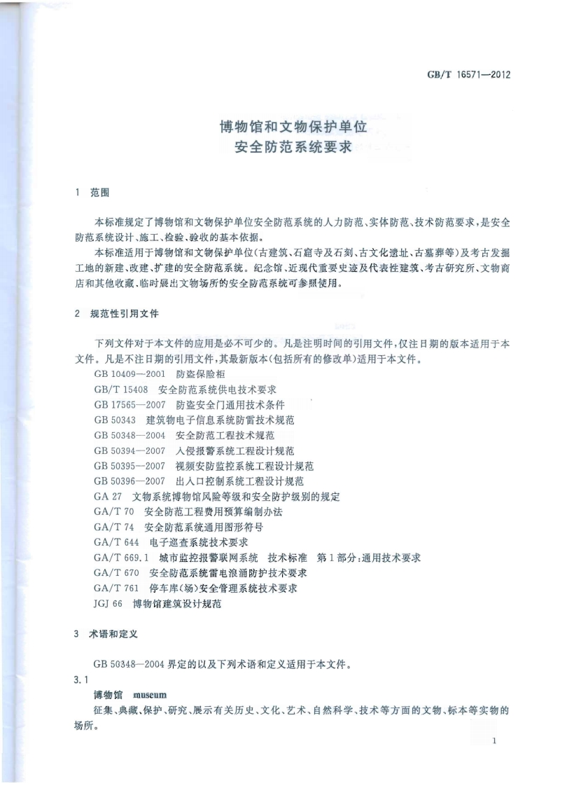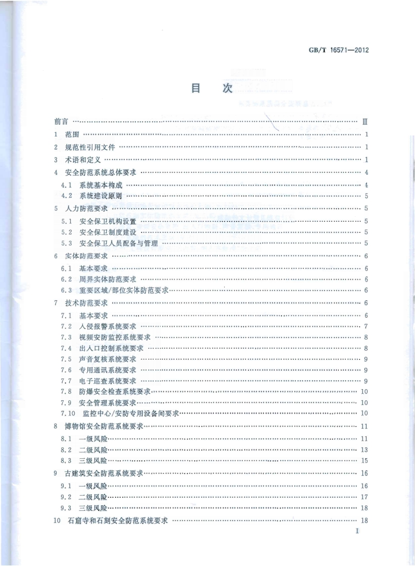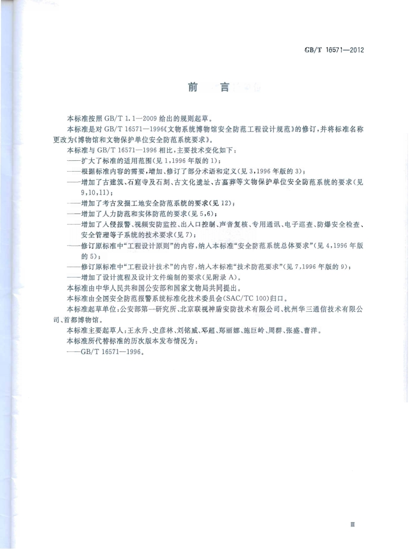 ICS13.310A91B中华人民共和国国家标准GB/T16571-2012代替GB/T16571一1996博物馆和文物保护单位安全防范系统要求Requirements for security systems inmuseums and units of cultural heritage protection2012-11-05发布2013-02-01实施中华人民共和国国家质量监督检验检疫总局网中国国家标准化管理委员会发布