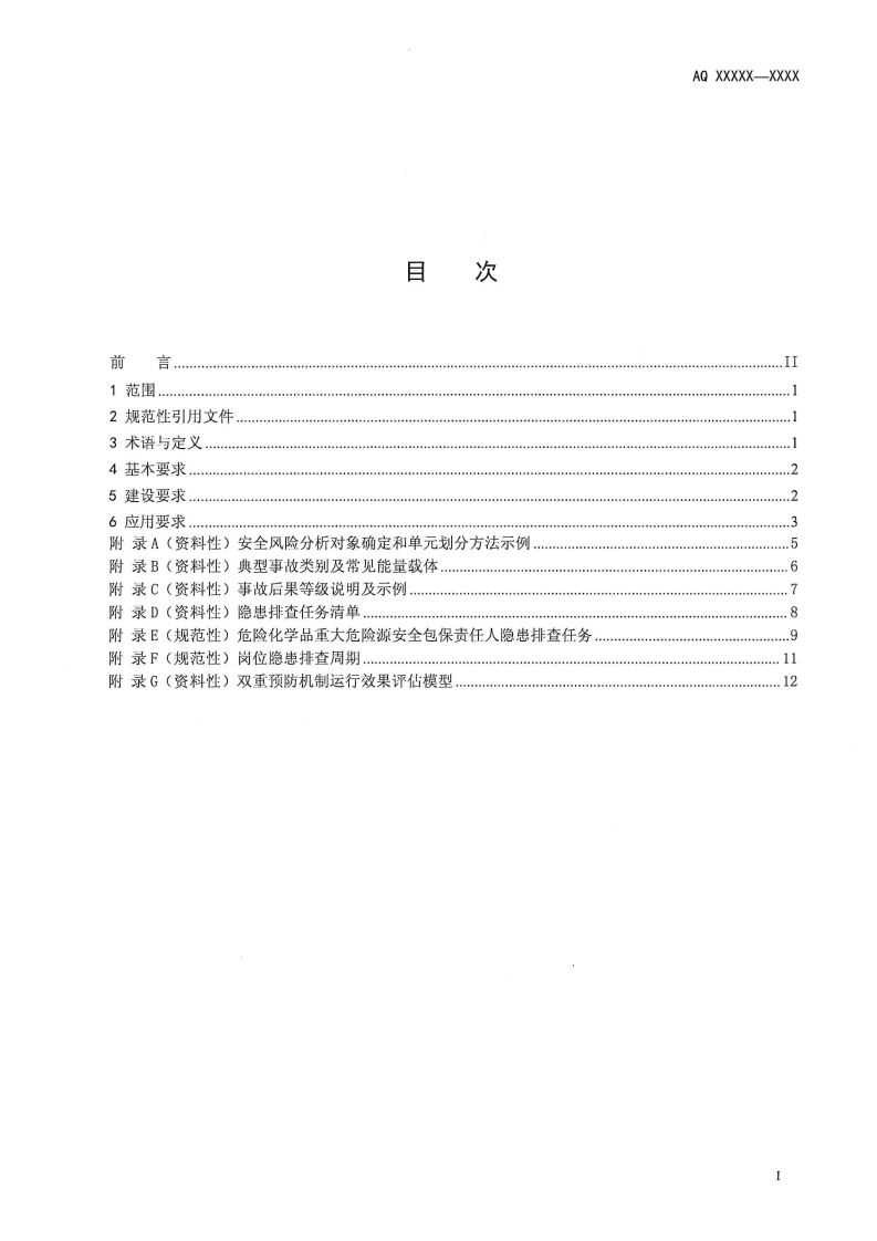 1cs13.100G09备案号:AQ中华人民共和国安全生产行业标准AQ XXXX-一XXXX危险化学品重大危险源企业双重预防机制建设应用规范Specifications for the Construction and Application of DualPrevention Mechanism in Enterprises with Major Hazard forHazardous Chemicals(征求意见稿)XXXX-XX-XX发布XXXX-XX-XX实施中华人民共和国应急管理部发布