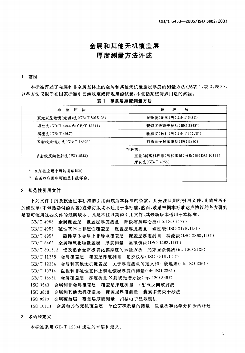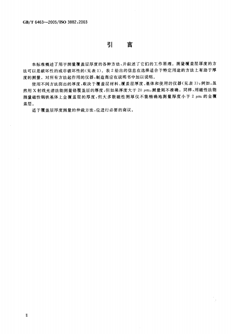 ICS25.220.20A29中华人民共和国国家标准GB/T6463一2005/IS03882:2003代替GB/T6463一1986金属和其他无机覆盖层厚度测量方法评述Metallic and other inorganic coatings-Review of methodsof measurement of thickness(IS03882:2003(E),IDT)2005-06-23发布2005-12-01实施中华人民共和国国家质量监督检验检疫总局中国国家标准化管理委员会发布