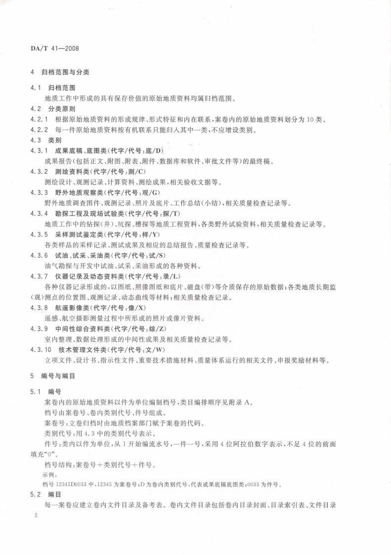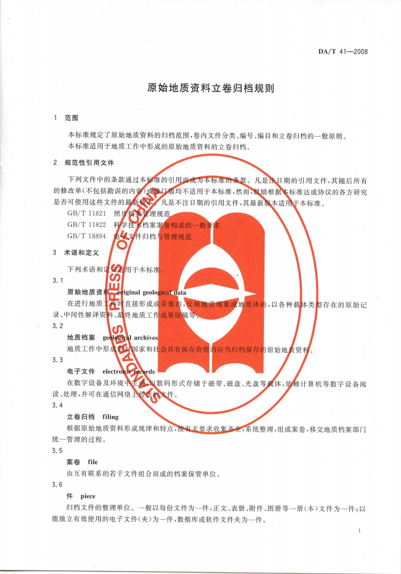 原始地质资料立卷归档规则Specificationsforfilingoforiginalgeologicaldata348072@abc7天前发布关注私信11.46MB17页040原始地质资料立卷归档规则Specificationsforfilingoforiginalgeologicaldata此内容为付费资源,请付费后查看¥23¥36黄金会员免费钻石会员免费立即购买您当前未登录!建议登陆后购买,可保存购买订单付费资源 第1页 / 共17页 第2页 / 共17页 第3页 / 共17页 第4页 / 共17页 第5页 / 共17页 试读已结束,还剩12页,您可下载完整版后进行离线阅读 THE END标准规范 文本预览 1CS01.140.20A14备案号:24240-2008DA中华人民共和国档案行业标准DA/T41-2008原始地质资料立卷归档规则Specifications for filing of original geological data2008-06-20发布2008-09-01实施数码防伪国家档案局·发布 查看更多 收起部分 喜欢就支持一下吧收藏