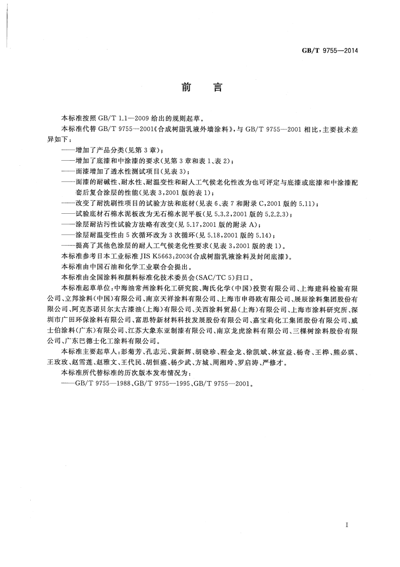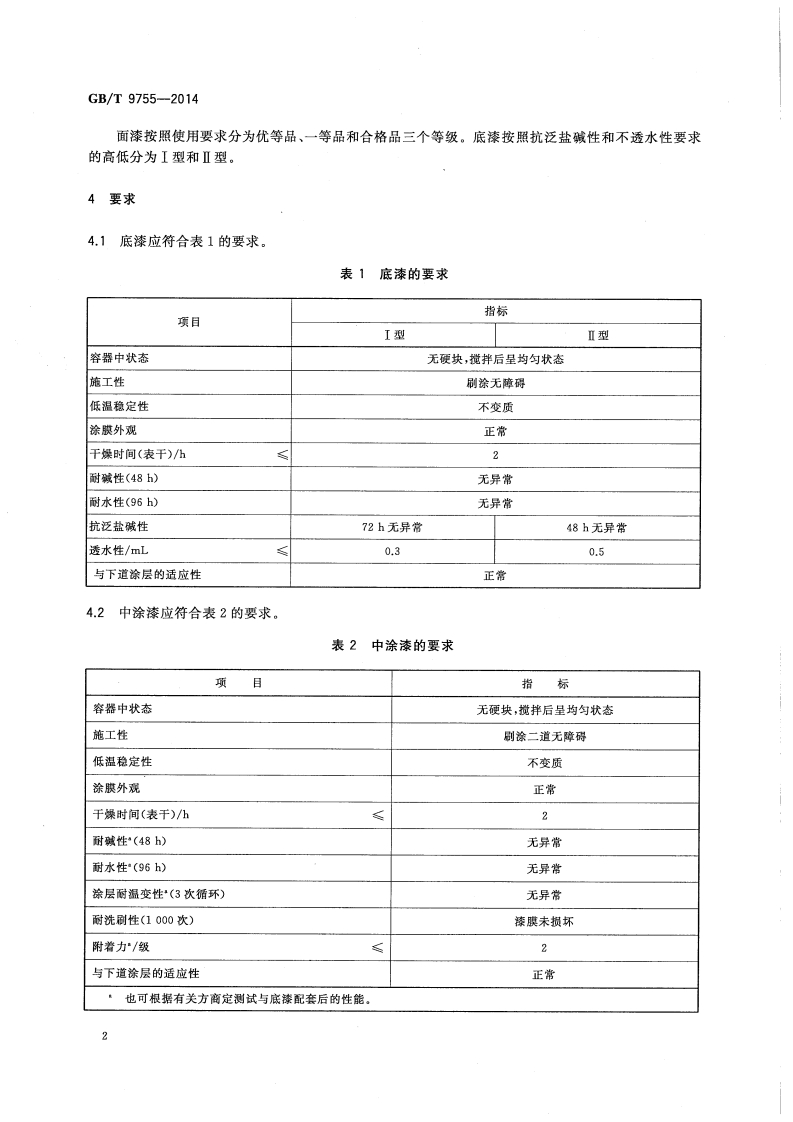 合成树脂乳液外墙涂料Syntheticresinemulsioncoatingsforexteriorwall348072@abc6天前发布关注私信1.47MB19页038合成树脂乳液外墙涂料Syntheticresinemulsioncoatingsforexteriorwall此内容为付费资源,请付费后查看¥23¥36黄金会员免费钻石会员免费立即购买您当前未登录!建议登陆后购买,可保存购买订单付费资源 第1页 / 共19页 第2页 / 共19页 第3页 / 共19页 第4页 / 共19页 第5页 / 共19页 试读已结束,还剩14页,您可下载完整版后进行离线阅读 THE END标准规范 文本预览 1CS87.040G51中华人民共和国国家标准GB/T9755-2014代替GB/T9755一2001合成树脂乳液外墙涂料Synthetic resin emulsion coatings for exterior wall2014-07-08发布2014-12-01实施中华人民共和国国家质量监督检验检疫总局2①中国国家标准化管理委员会发布 查看更多 收起部分 喜欢就支持一下吧收藏