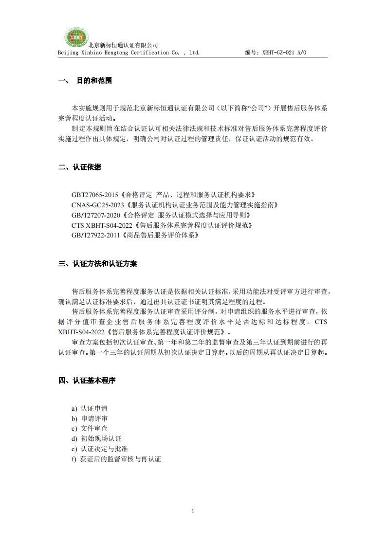 售后服务体系完善程度认证规则XBHT-GZ-021A_0A_1版2025年6月10日修订348072@abc6天前发布关注私信0.25MB9页029售后服务体系完善程度认证规则XBHT-GZ-021A_0A_1版2025年6月10日修订此内容为付费资源,请付费后查看¥23¥36黄金会员免费钻石会员免费立即购买您当前未登录!建议登陆后购买,可保存购买订单付费资源 第1页 / 共9页 第2页 / 共9页 第3页 / 共9页 第4页 / 共9页 第5页 / 共9页 试读已结束,还剩4页,您可下载完整版后进行离线阅读 THE END标准规范 文本预览 北京新标恒通认证有限公司Beijing Xinbiao Hengtong Certification Co.,Ltd.编号:XBHT-GZ-021A/0售后服务体系完善程度认证规则XBHT-GZ-021 A/0A/1版2025年6月10日修订2022-03-29发布2022-03-29实施北京新标恒通认证有限公司发布 查看更多 收起部分 喜欢就支持一下吧收藏