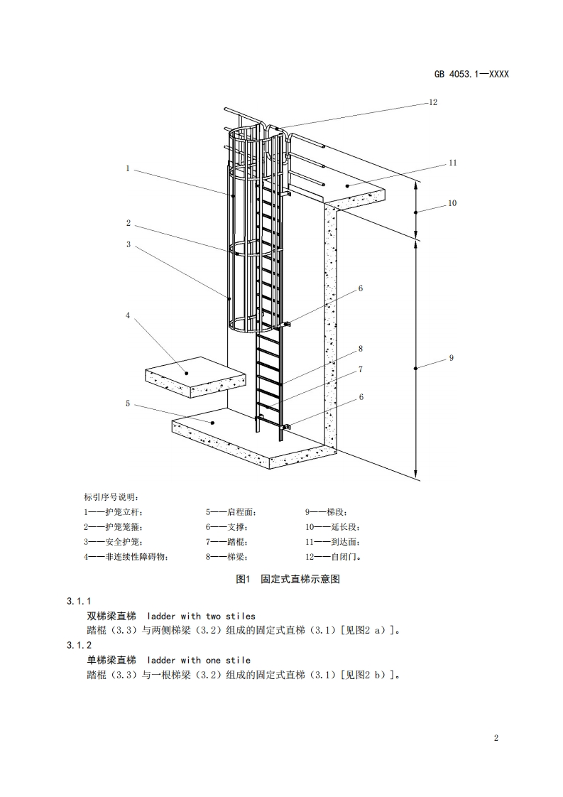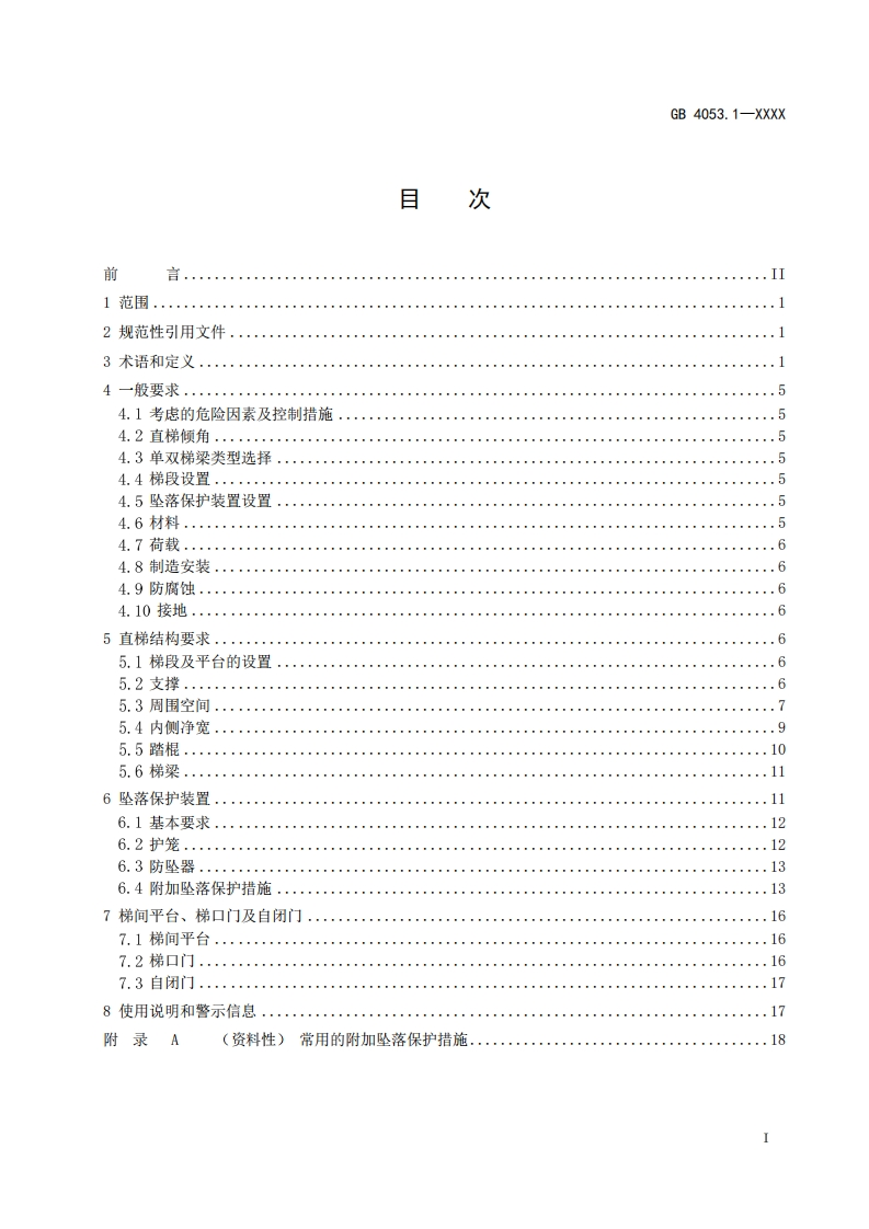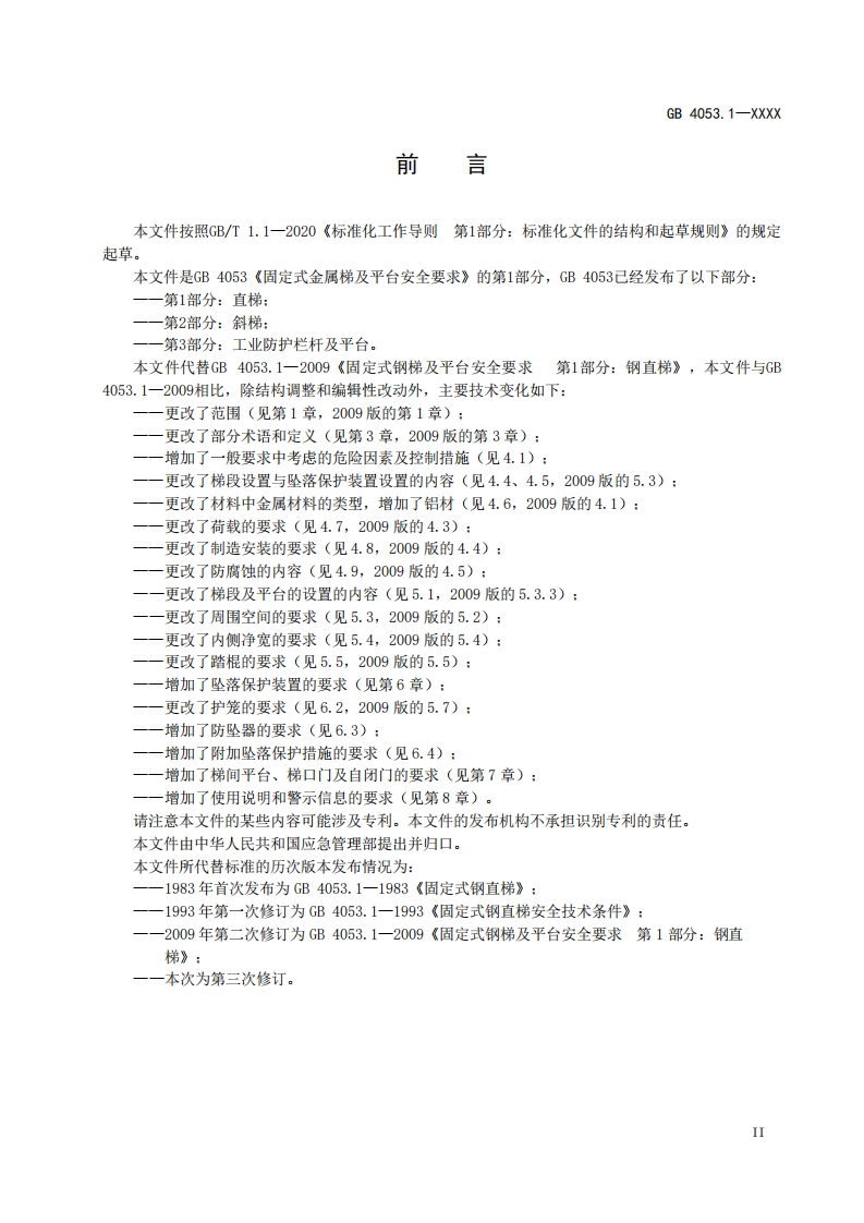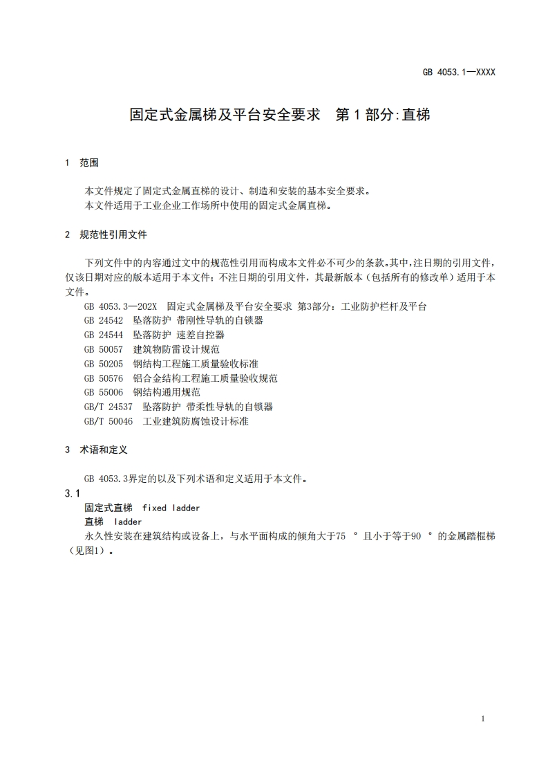 ICS13.100CCS C 68GB中华人民共和国国家标准GB 4053.1-XXXX代替GB4053.1-2009固定式金属梯及平台安全要求第1部分:直梯Safety requirements for fixed metal ladders and platform-Part 1:Vertical ladders(征求意见稿)在提交反债意见时,请将您知道的相关专利连同支持性文件一并附上。XXXX-Xx-XX发布XXXX-Xx-X实施国家市场监督管理总局发布国家标准化管理委员会