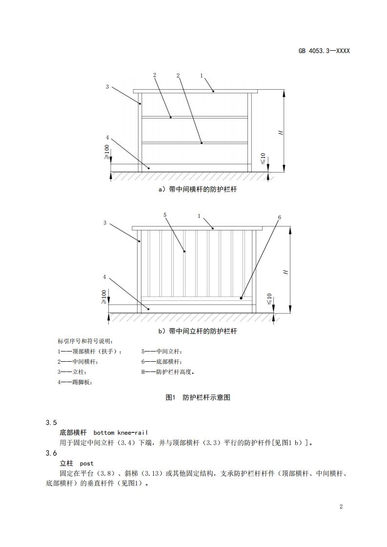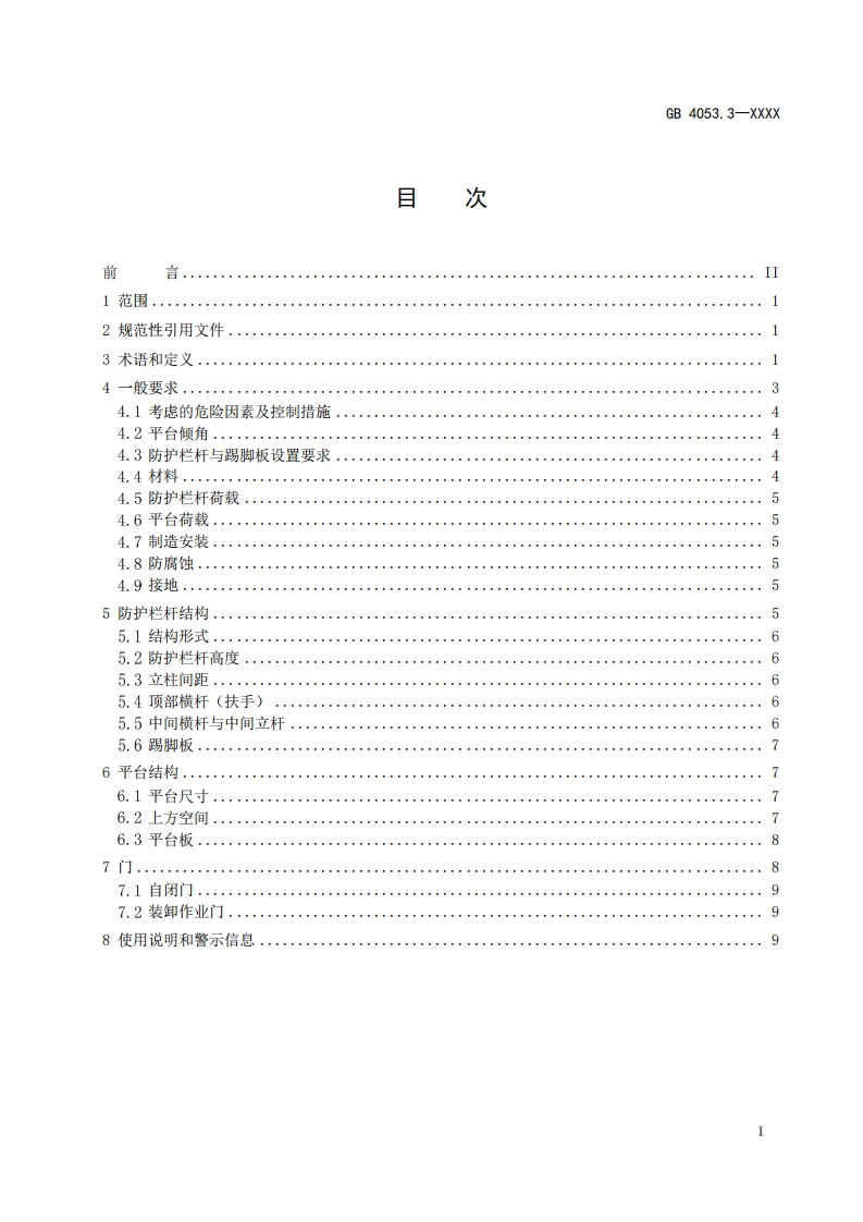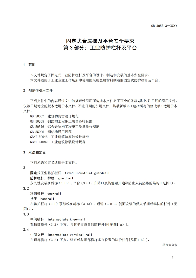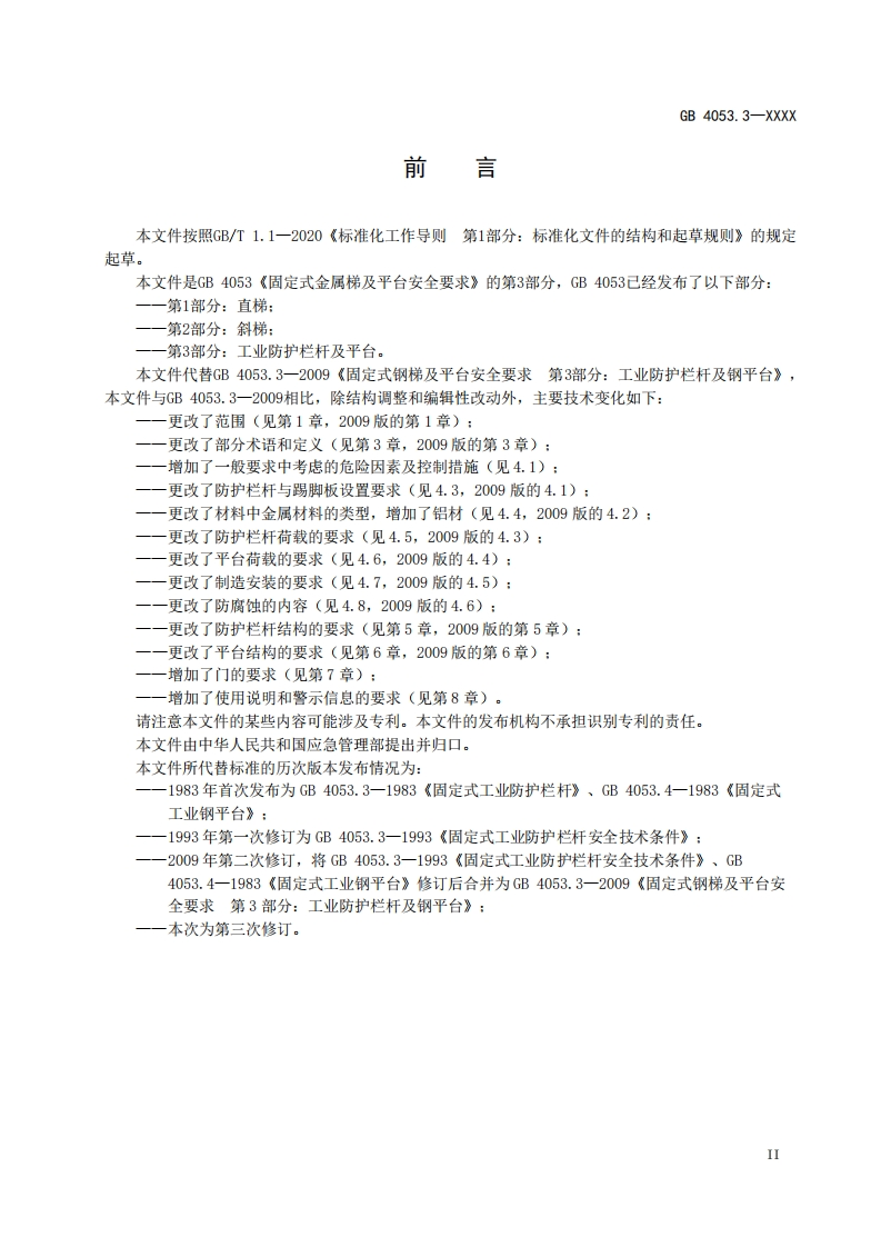 ICS13.100CCS C 68GB中华人民共和国国家标准GB 4053.3-XXXX代替GB4053.3-2009固定式金属梯及平台安全要求第3部分:工业防护栏杆及平台Safety requirements for fixed metal ladders and platform-Part 3:Industrial guardrails and platform(征求意见稿)在提交反债意见时,请将您知道的相关专利连同支持性文件一并附上。XXXX-Xx-XX发布XXXX-Xx-X实施国家市场监督管理总局发布国家标准化管理委员会