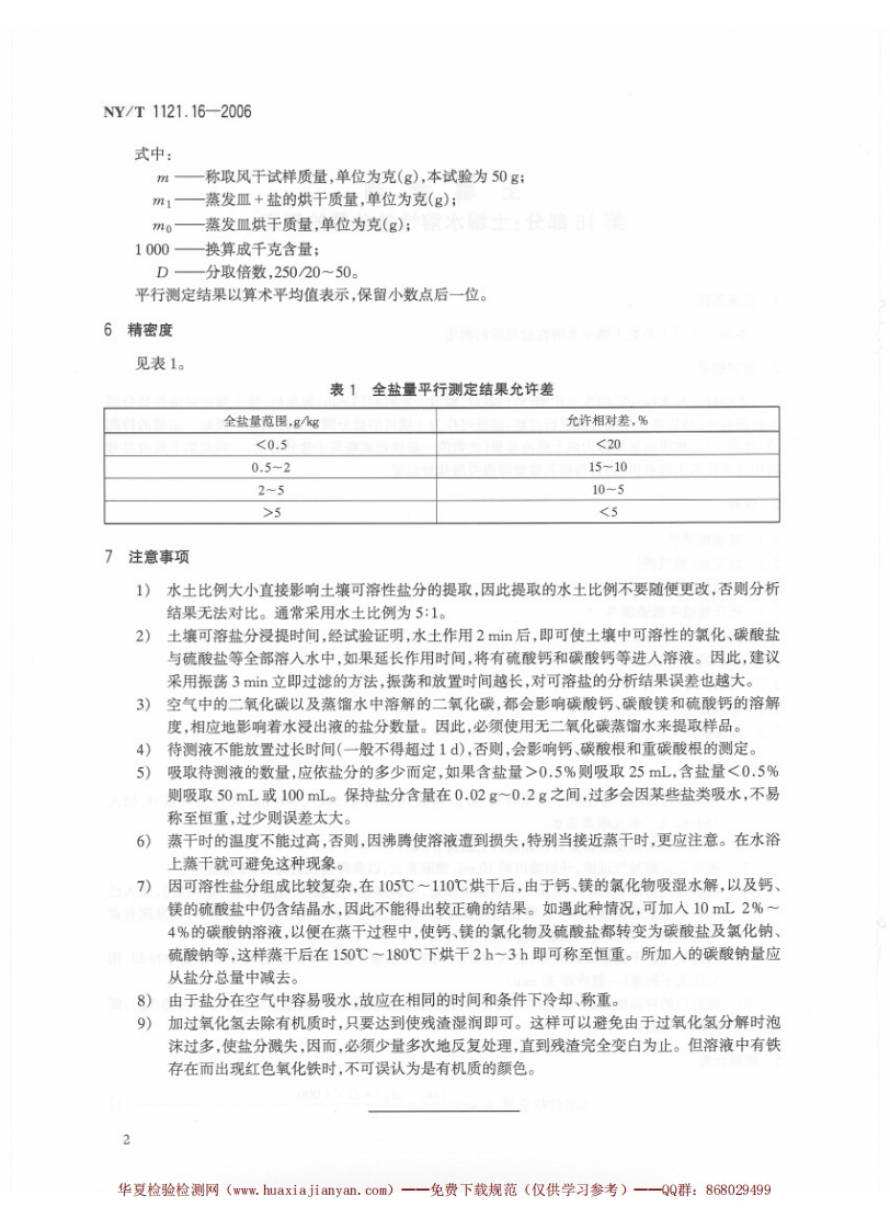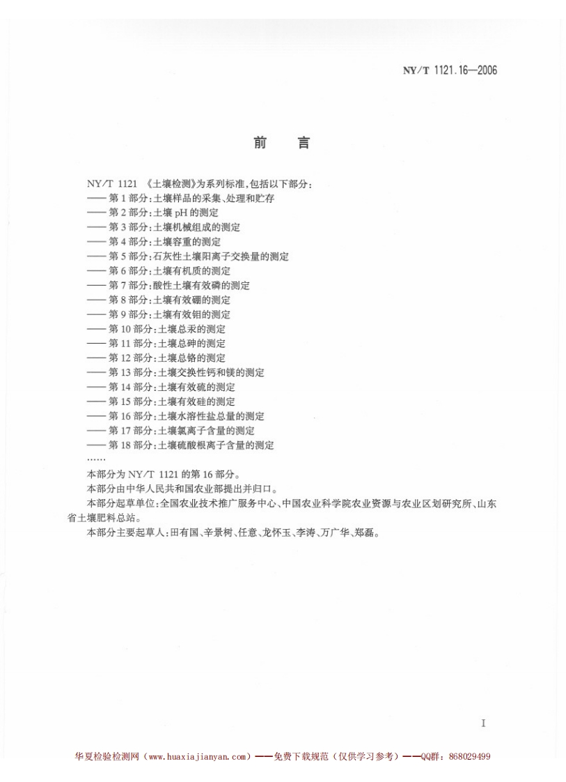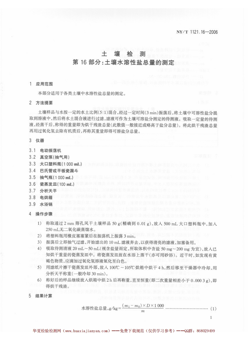 土壤检测第16部分_土壤水溶性盐总量的测定SoilTestingPart16_Methodfordeterminationoftotalwater-solublesalt348072@abc6天前发布关注私信0.51MB4页031土壤检测第16部分_土壤水溶性盐总量的测定SoilTestingPart16_Methodfordeterminationoftotalwater-solublesalt此内容为付费资源,请付费后查看¥23¥36黄金会员免费钻石会员免费立即购买您当前未登录!建议登陆后购买,可保存购买订单付费资源 第1页 / 共4页 第2页 / 共4页 第3页 / 共4页 第4页 / 共4页 已完成全部阅读,共4页 THE END标准规范 文本预览 1Cs13.080.05B11NY中华人民共和国农业行业标准NY/T1121.16-2006土壤检测第16部分:土壤水溶性盐总量的测定Soil TestingPart 16:Method for determination of total water-soluble salt2006-07-10发布2006-10-01实施中华人民共和国农业部发布 查看更多 收起部分 喜欢就支持一下吧收藏