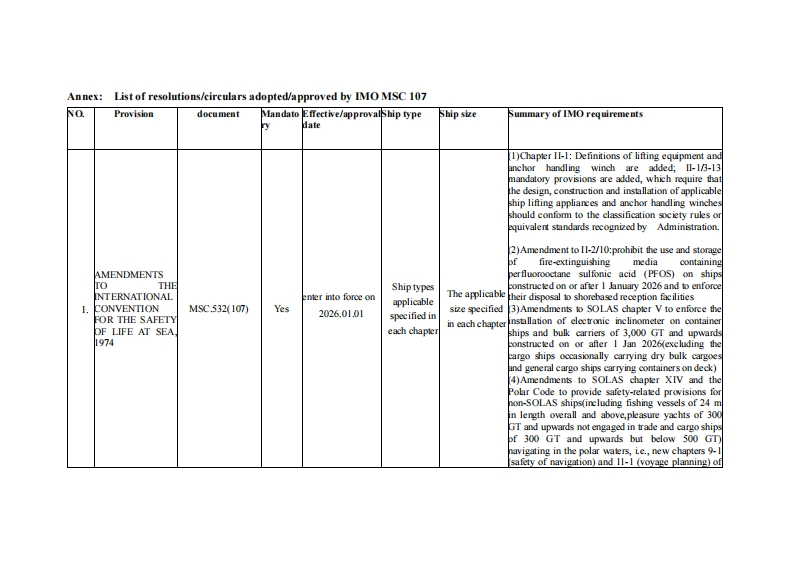 CCSTechnical Information(2023)Technical Information No.25 Total No.625Nov.30,2023(Total 18 pages)To:Relevant shipowners,ship management companies,shipyards and designers,productmanufacturer,related departments of the Headquarters of CCS,the Society's surveyors,Plan Approval CentersTechnical Notice on Resolutions/Circulars Adopted/Approved byIMO MSC 107The Maritime Safety Committee of the International Maritime Organization,atits 107th session,adopted 16 resolutions of amendments to the 1974 SOLASConvention,the 1978 Protocol to the 1974 SOLAS Convention,the 1988 Protocol tothe 1974 SOLAS Convention and the LSA Code.In addition,MSC107 also approved a total of 27 circulars,including Guide toLifting Equipment (MSC.1/Circ.1663)and Interim Guide to the Safety of Ships UsingLPG Fuel (MSC.1/Circ.1666).For summary,please refer to the attached List of resolutions/circularsadopted/approved by IMO MSC 107.This Notice is made public on CCS website(www.ccs.org.cn),and is to be notified to relevant ship owners,ship managementcompanies,shipyards,marine product manufacturers by CCS survey units withintheir responsible areas.Please contact the Technology Information Department ofCCS for any inquiry in this regard E-mail address:ti@ccs.org.cn).Annex:List of resolutions/circulars adopted/approved by IMO MSC 107