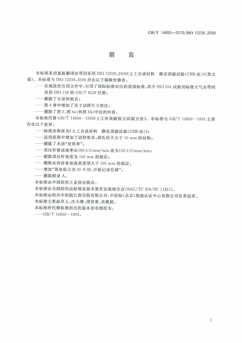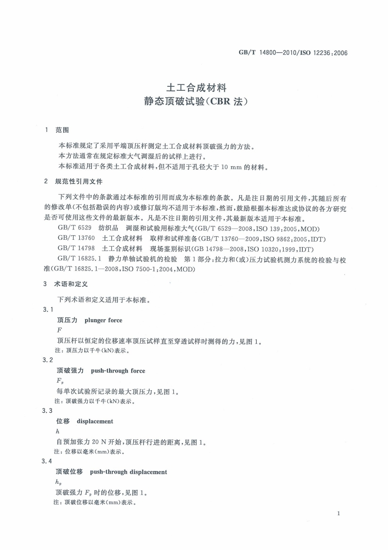 59.080.70中华人民共和国国家标准GB/T14800-2010/IS012236:2006代替GB/T14800一1993土工合成材料静态顶破试验(CBR法)Geosynthetics-Static puncture test (CBR test)(ISO12236:2006,IDT)2011-01-10发布2011-06-01实施中华人民共和国国家质量监督检验检疫总局中国国家标准化管理委员会发布数码防伪