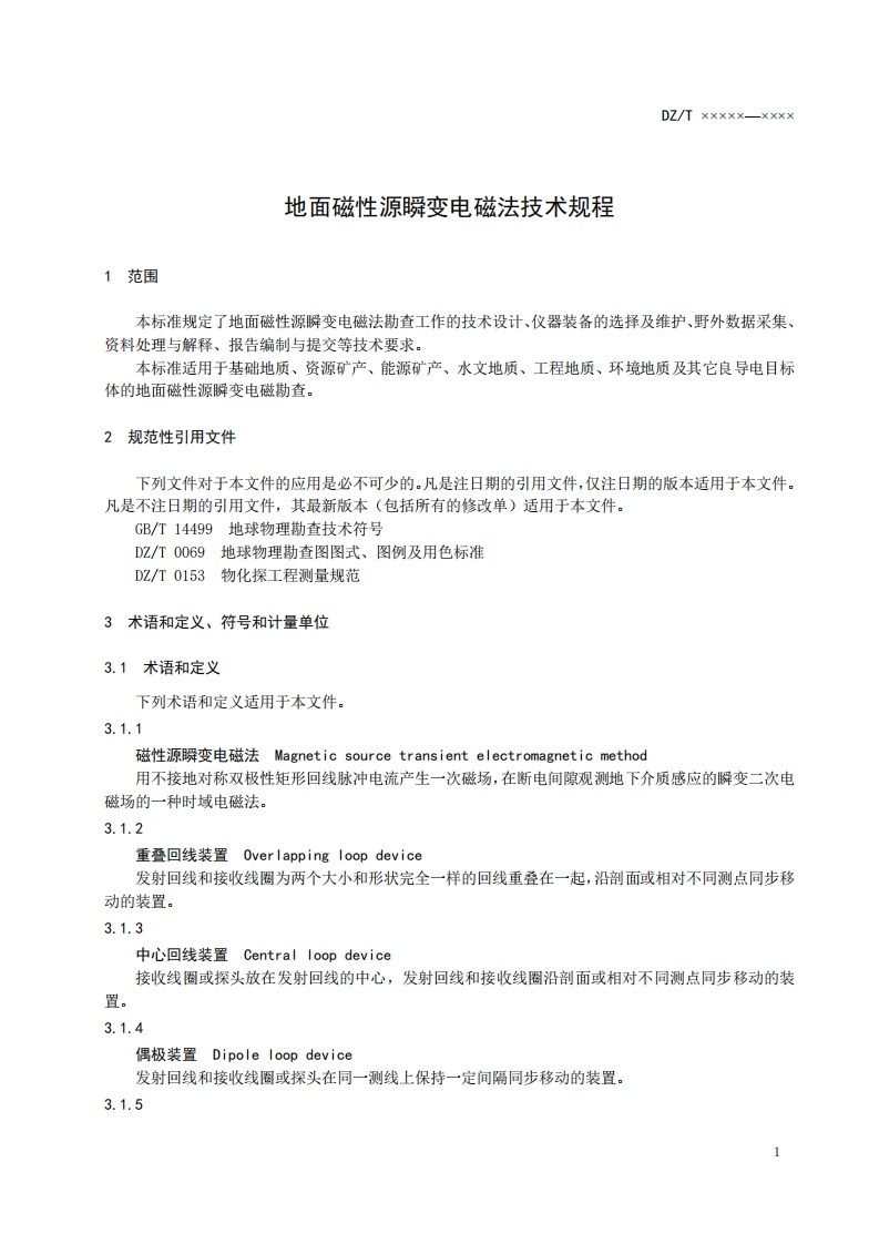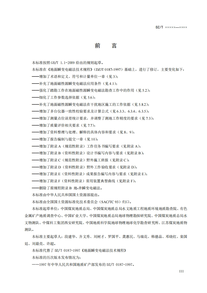 ICS点击此处添加中国标准文献分类号DZ中华人民共和国地质矿产行业标准DZTX×XXX一X×X×代替DZ/T0187-1997地面滋性源瞬变电磁法技术规程Technical specification for ground magnetic source transient electromagnetic method点击此处添加与国际标准一致性程度的标识(报批稿)××X×一××一××发布××一××一××实施中华人民共和国国土资源部发布