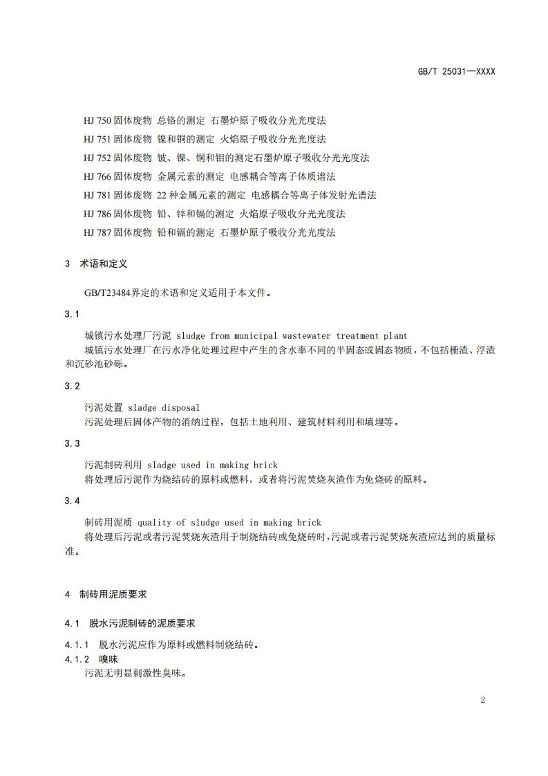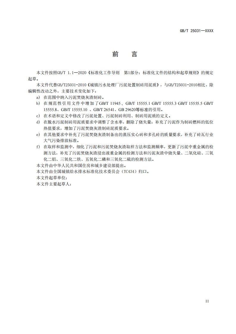 ICS93.030CCS P41GB中华人民共和国国家标准GB/T 25031-XXXX代替GB/T25031-2010城镇污水处理厂污泥处置制砖用泥质Disposal of sludge from municipal wastewater treatment plant-Quality of sludge used in making brick(修订征求意见稿)在提交反债意见时,请将您知道的相关专利连同支持性文件一并附上。XXXX-Xx-XX发布XXXX-Xx-XX实施国家市场监督管理总局发布国家标准化管理委员会