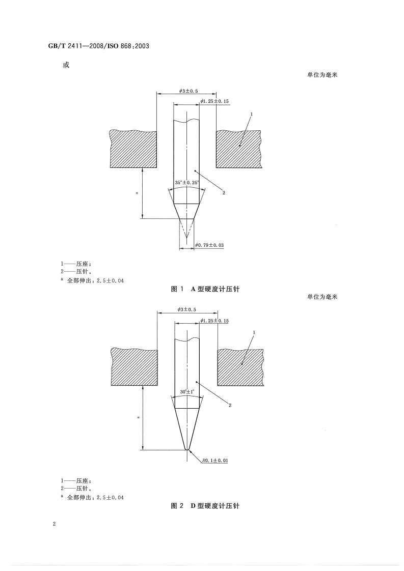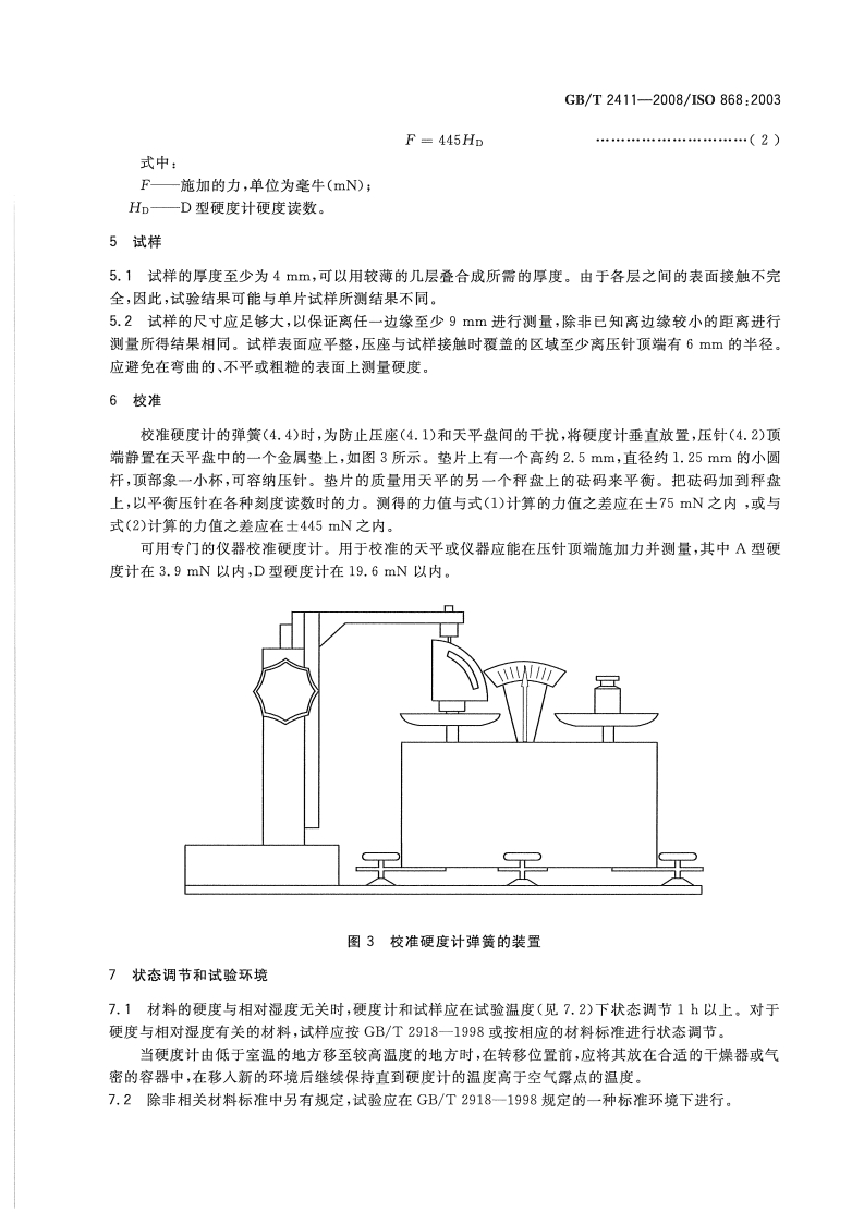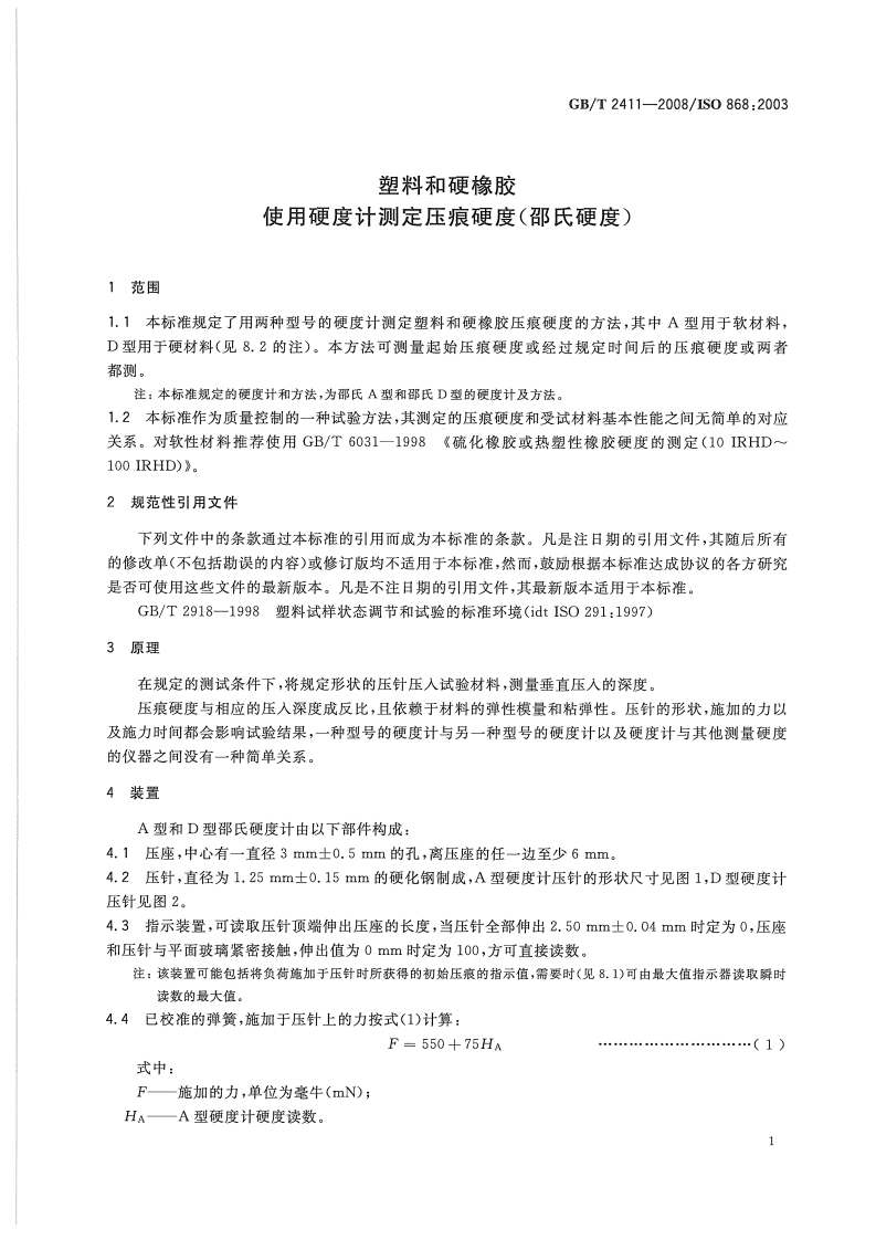 ICS83.080G31中华人民共和国国家标准GB/T2411-2008/IS0868:2003代替GB/T2411-1980塑料和硬橡胶使用硬度计测定压痕硬度(邵氏硬度)Plastics and ebonite-Determination of indentation hardnessby means of a durometer(shore hardness)(IS0868:2003,IDT)2008-08-04发布2009-04-01实施中华人民共和国国家质量监督检验检疫总局中国国家标准化管理委员会发布