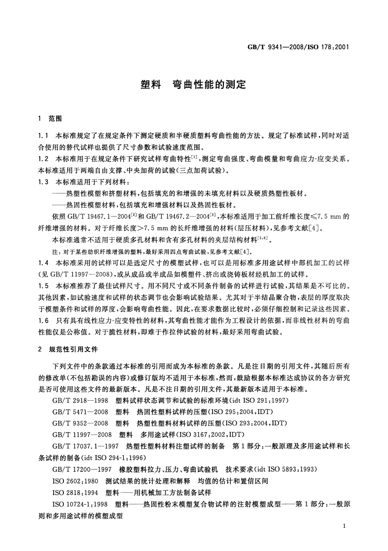 ICS83.080.01G31中华人民共和国国家标准GB/T9341-2008/IS0178:2001代替GB/T9341一2000塑料弯曲性能的测定Plastics-Determination of flexural properties(IS0178:2001,IDT)2008-08-04发布2009-04-01实施中华人民共和国国家质量监督检验检疫总局发布中国国家标准化管理委员会