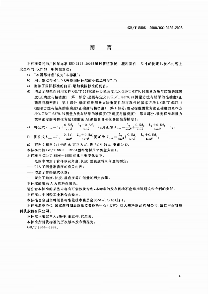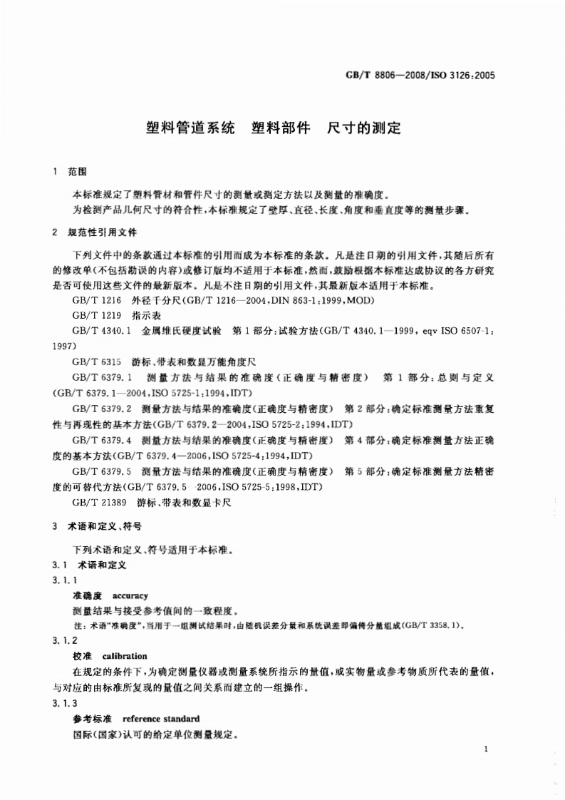1C583.140.30G33中华人民共和国国家标准GB/T8806-2008/IS03126:2005代替GB/T8806一1988塑料管道系统塑料部件尺寸的测定Plastics piping systems-Plastics components-Determination of dimensions(IS03126:2005,IDT)2008-08-19发布2009-05-01实施中华人民共和国国家质量监督检验检疫总局中国国家标准化管理委员会发布