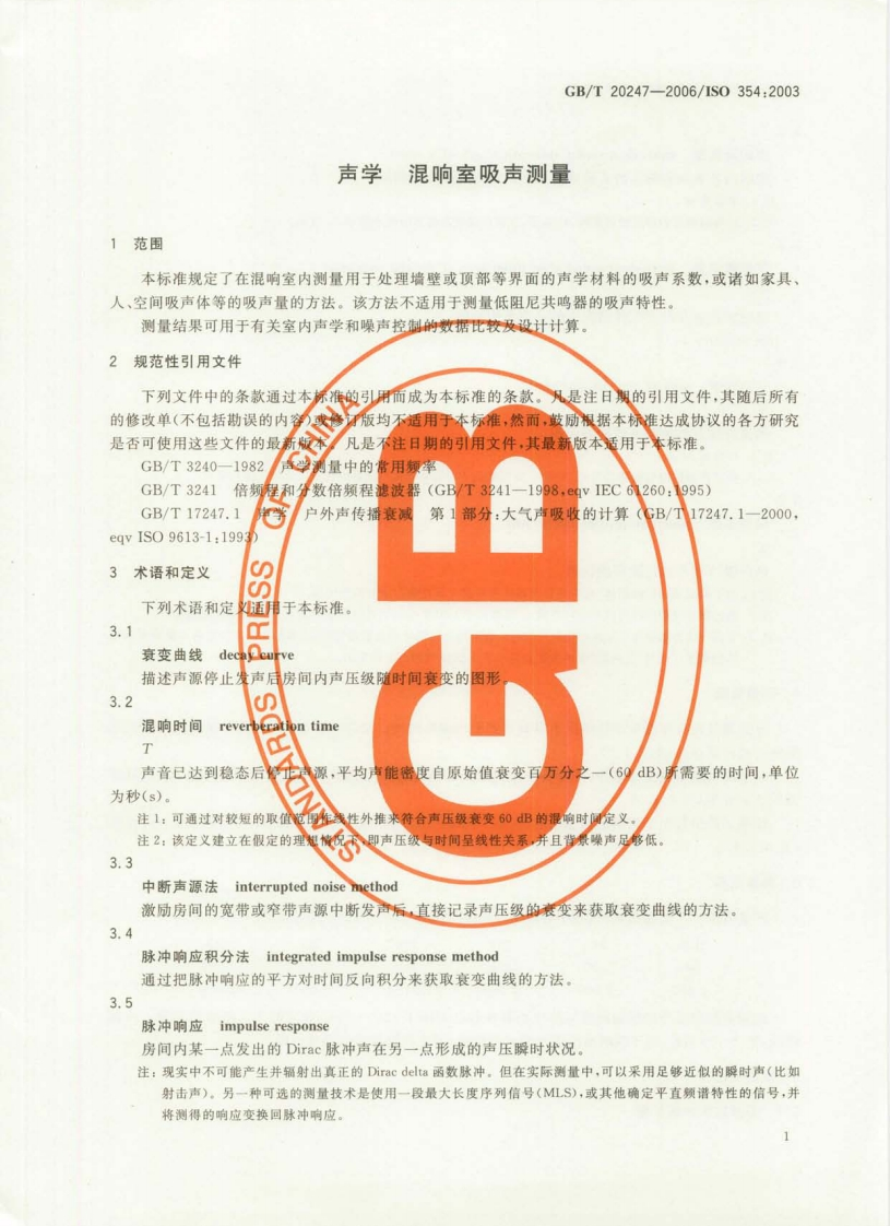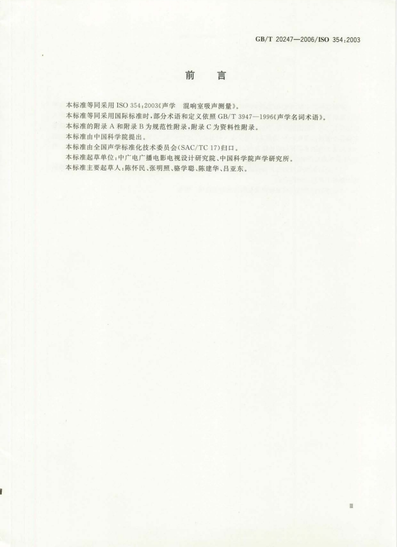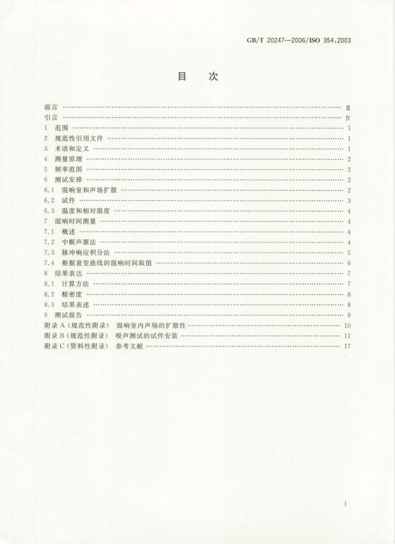 ICS17.140A59中华人民共和国国家标准GB/T20247-2006/1S0354:2003声学混响室吸声测量Acoustics-Measurement of sound absorption in a reverberation room(IS0354:2003,IDT)2006-05-08发布2006-11-01实施中华人民共和国国家质量监督检验检疫总局中国国家标准化管理委员会发布数码防伪